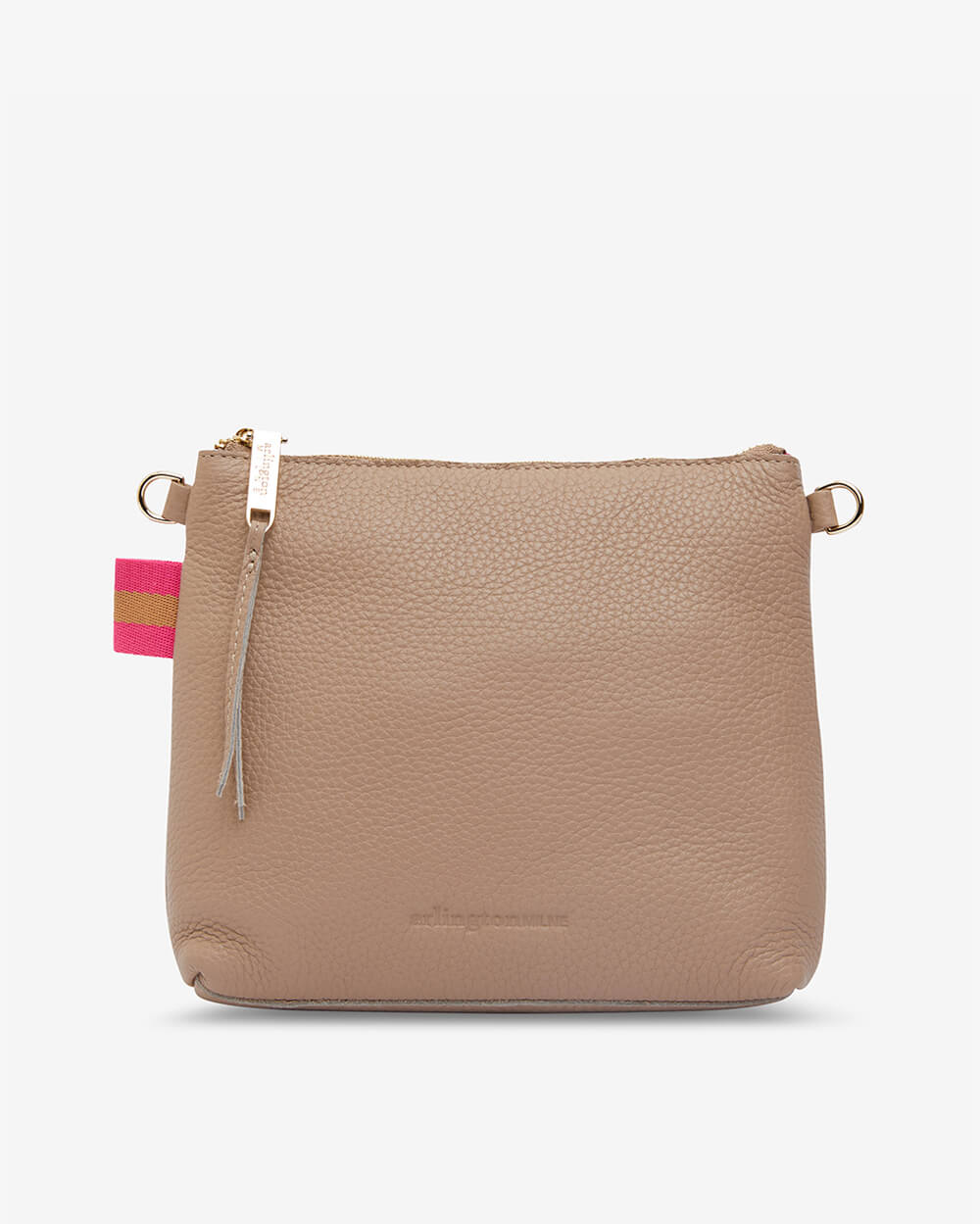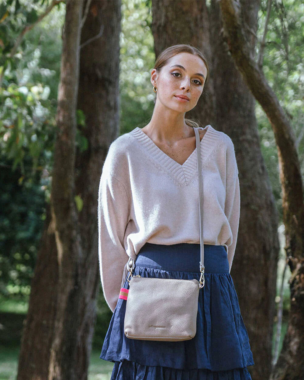 The Arlington Milne Alexis Crossbody in Chalk is crafted from premium leather. The bag features light gold hardware, an embossed logo and an adjustable/removable crossbody strap with raw edge detail. Secured with a top zipper, the bag opens to reveal Arlington Milne's signature hot pink lining and 3 leather card slots.