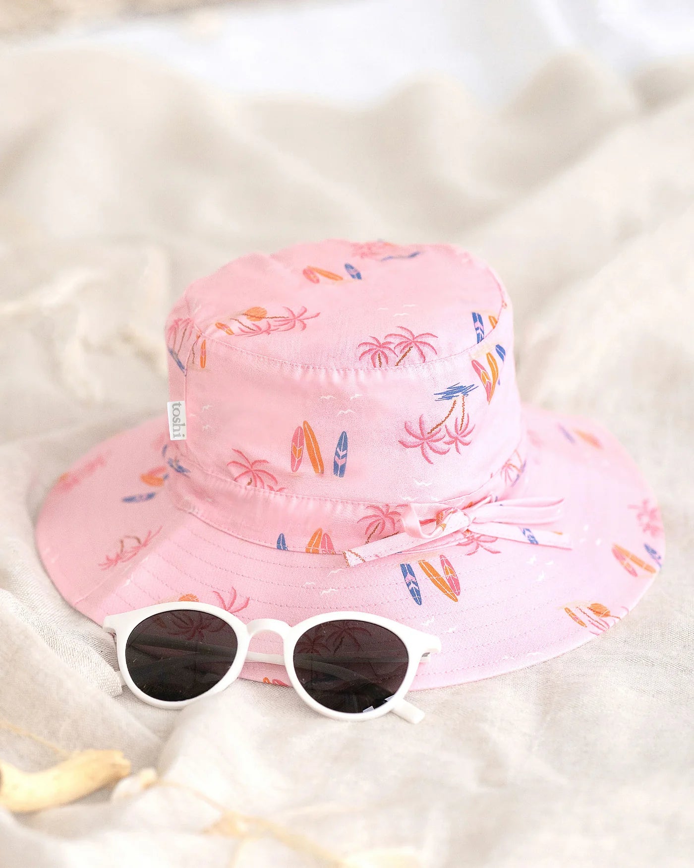 Toshi presents the classic Sunhat Dreaming, ideal for children of all ages. Our sunhat has a broad and well-structured brim offers maximised sun protection. A UPF 50+ UV rating is provided for colourway Seahorse. A UPF 30+ UV rating is provided for colourway Turtle. A head tie creates adjustable sizing and the chin tie with toggle secures the hat for ease of wear. The security release clasp on the chin tie is designed to enhance wearer safety. The classic Toshi Sunhat is crafted from the finest quality 100% cotton and is fully lined for additional comfort.