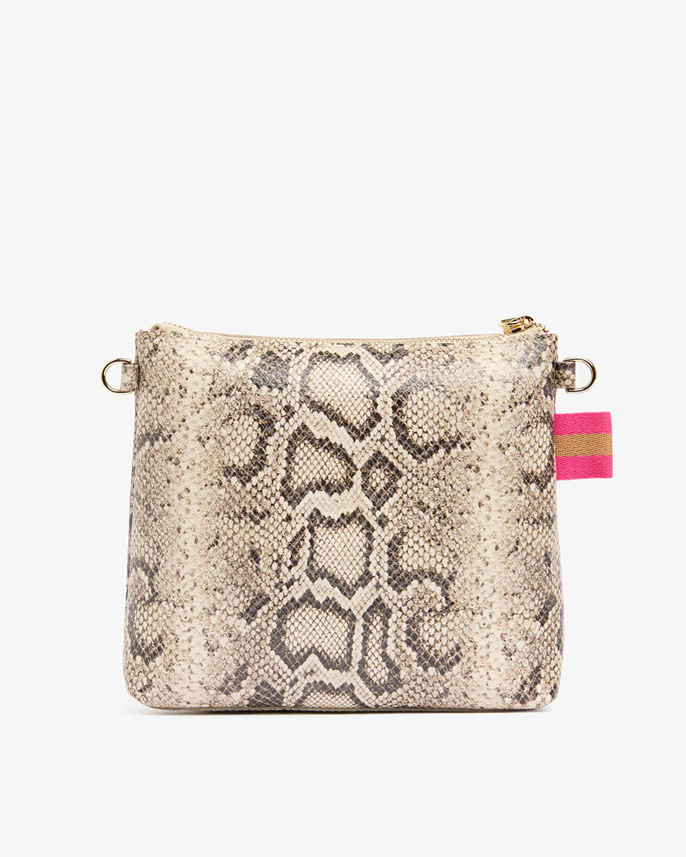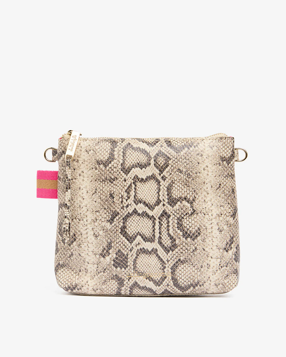The Arlington Milne Alexis Crossbody in Snake is crafted from premium leather. The bag features light gold hardware, an embossed logo and an adjustable/removable crossbody strap with raw edge detail. Secured with a top zipper, the bag opens to reveal Arlington Milne's signature hot pink lining and 3 leather card slots.