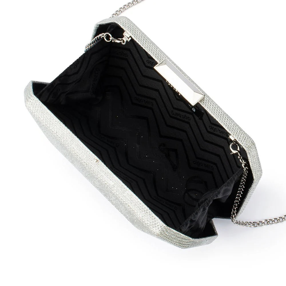 The AVERY Faceted Clutch catches the light beautifully with its geometric design. Perfect for an evening out, this clutch combines modern sophistication with a touch of playful elegance and includes a removable shoulder chain that conveniently tucks inside when not in use.