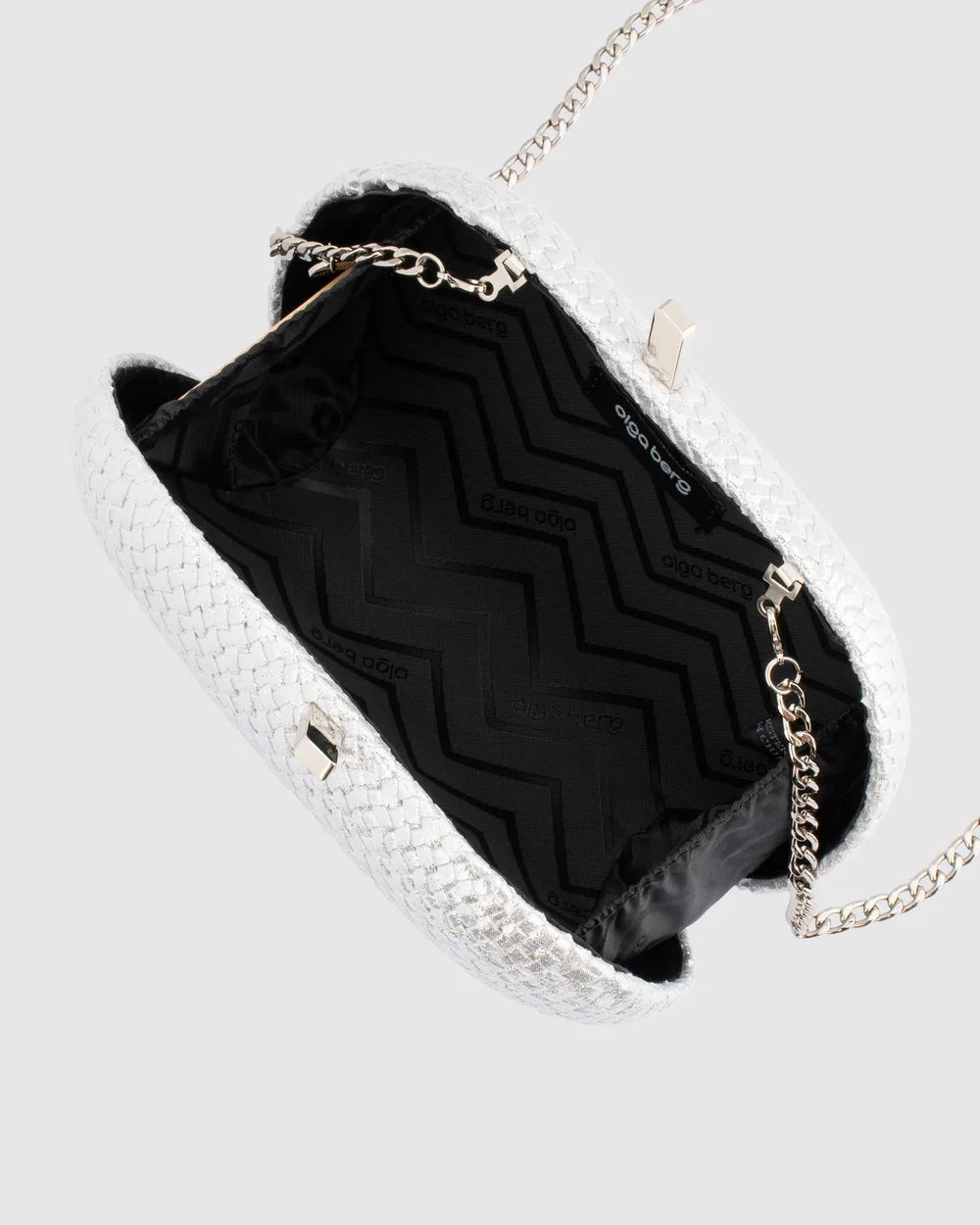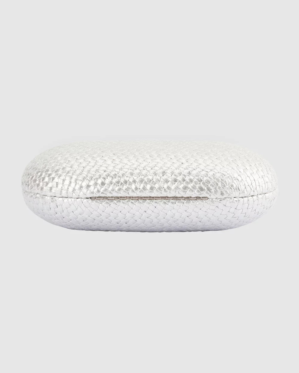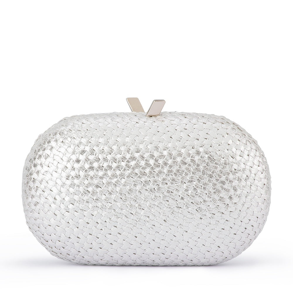 The Lucia Woven Oval Clutch by Olga Berg is the perfect blend of luxury and function. With its intricate woven metallic fabric, timeless hard case design, and convenient removable shoulder chain, this clutch is the ideal accessory for any special occasion. Create a beautiful statement with timeless elegance.