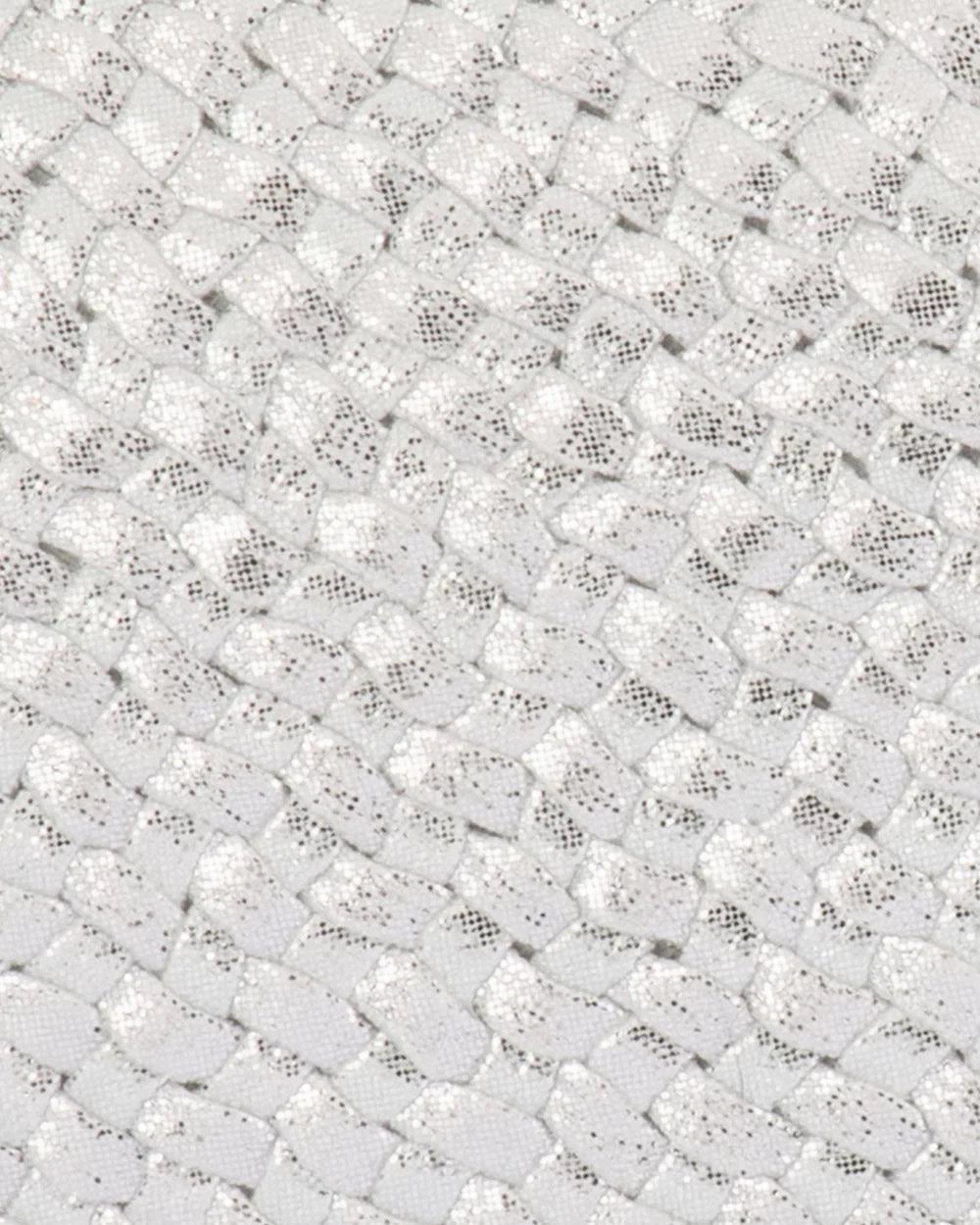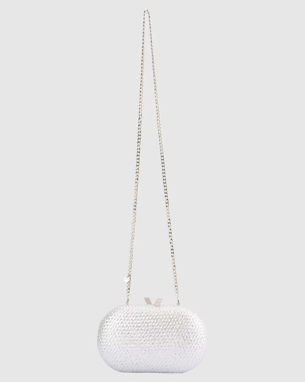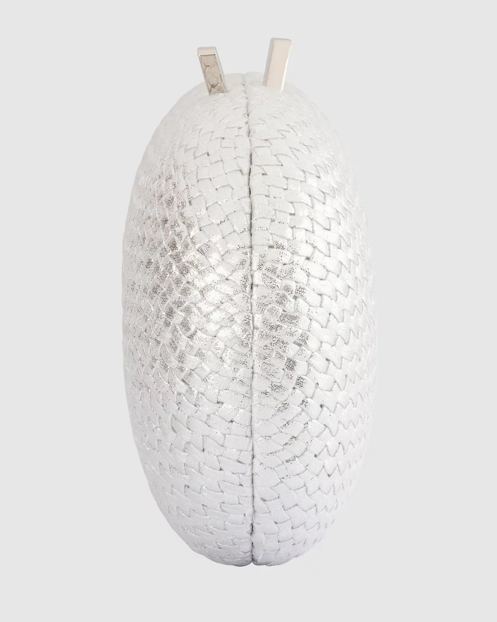 The Lucia Woven Oval Clutch by Olga Berg is the perfect blend of luxury and function. With its intricate woven metallic fabric, timeless hard case design, and convenient removable shoulder chain, this clutch is the ideal accessory for any special occasion. Create a beautiful statement with timeless elegance.