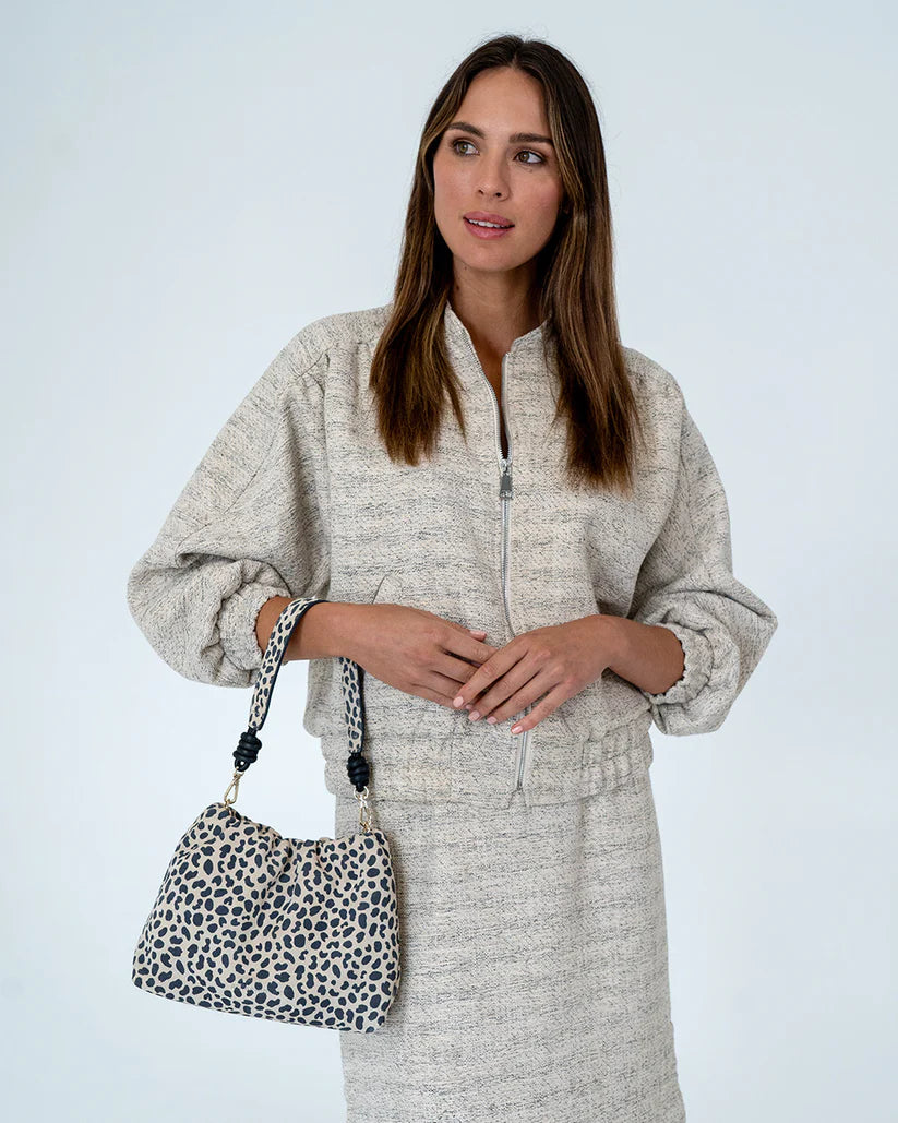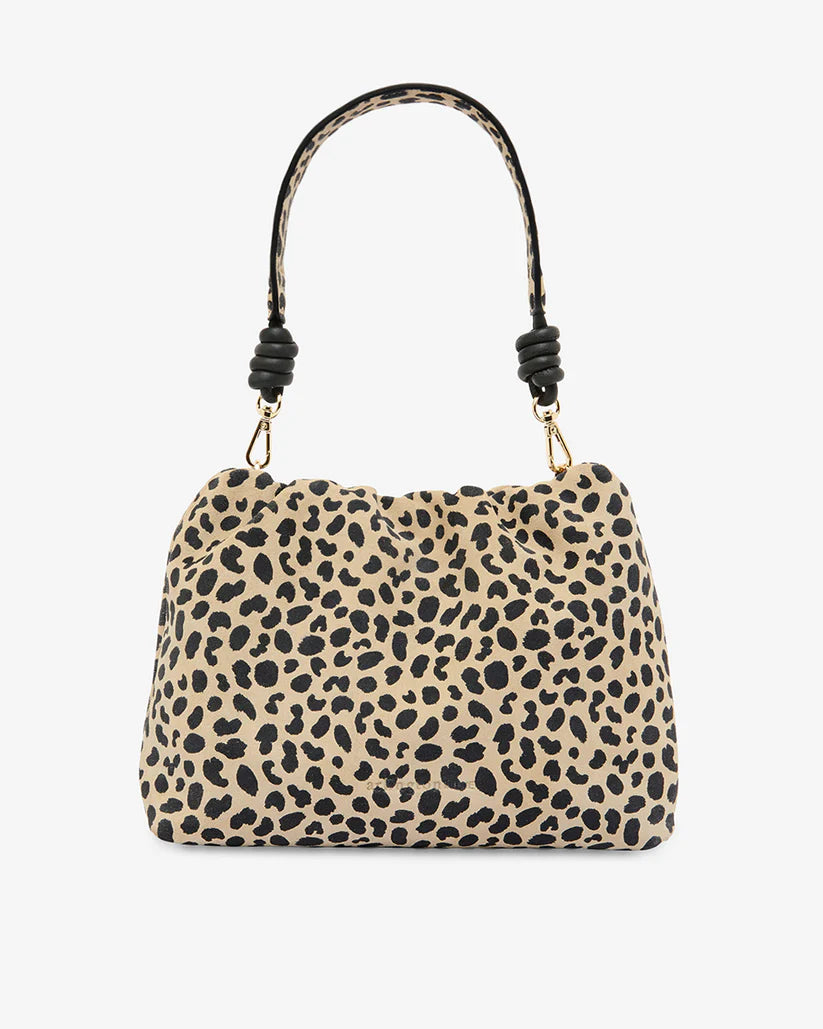The Arlington Milne Martha Bag is crafted from premium leather. It has a soft body construction with gathered top detail and features both an accent flat chain strap and a top grip handle with knot detail. The Martha Bag opens to reveal a centre compartment lined with Arlington Milnes signature hot pink lining and including a leather trimmed, zip slip pocket.