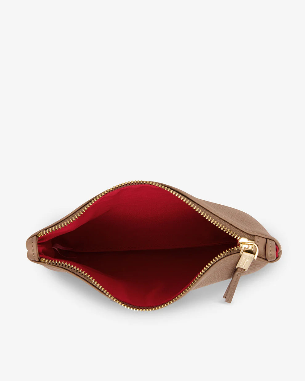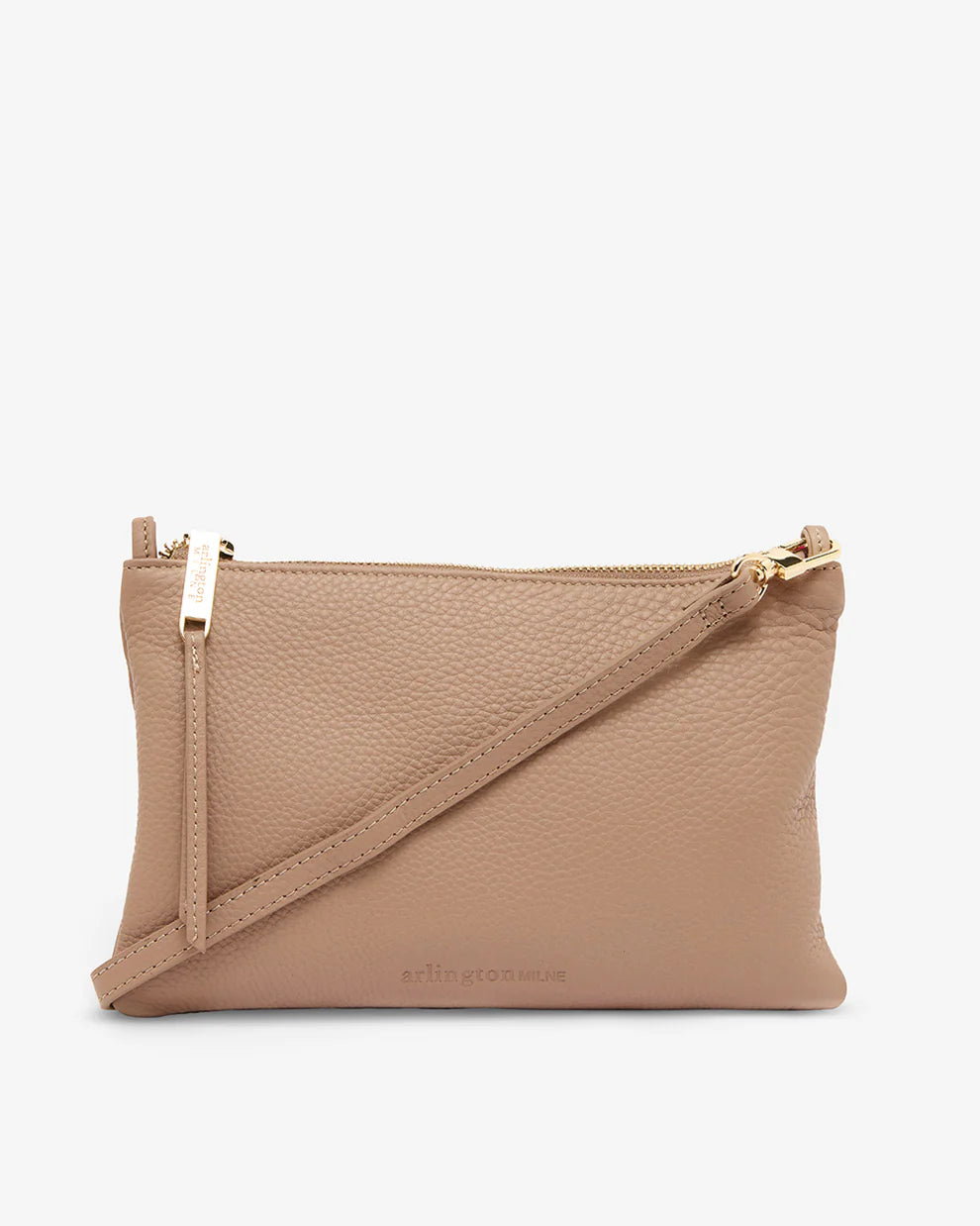 The Arlington Milne Molly Crossbody is crafted from premium pebble leather. The soft bodied, compact crossbody bag features light gold hardware, an embossed logo and two strap options. The top zipper opens to an ample centre compartment featuring Arlington Milnes signature hot pink lining.