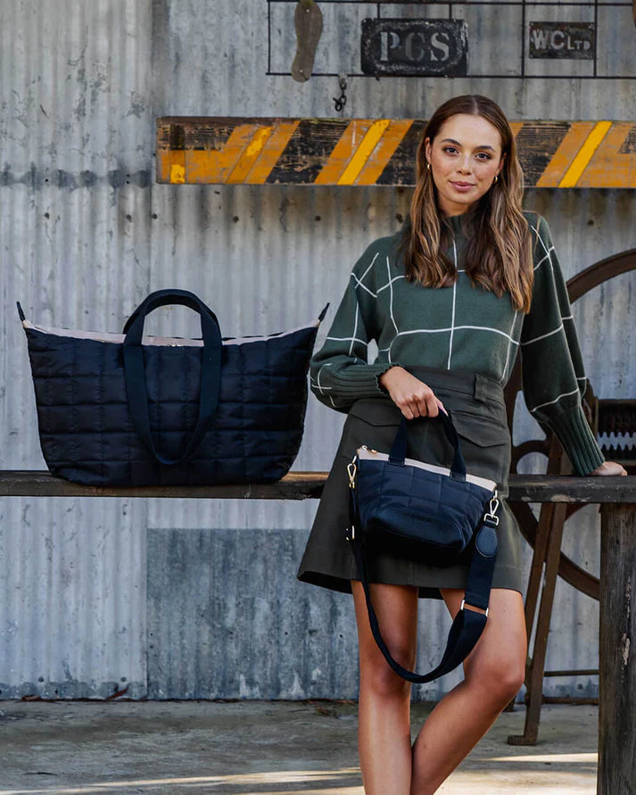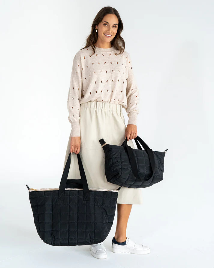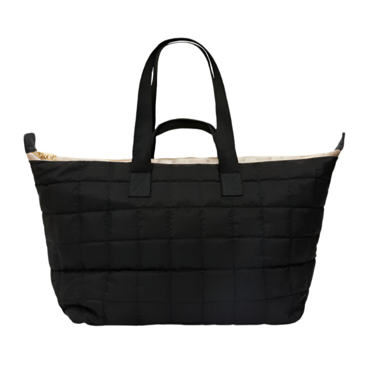 The Elms+King Spencer Carry All is the stylish weekend accessory we have all been dreaming of. With its two top-grip handles of varying drop height and an internal zip-pocket for ease of access, this Carry All can be used as a weekender, beach bag or everyday accessory for those of us always on the move. Made from premium quilted nylon with 14-karat light gold-plated hardware, the Spencer Carry All features a bright pop nylon lining.