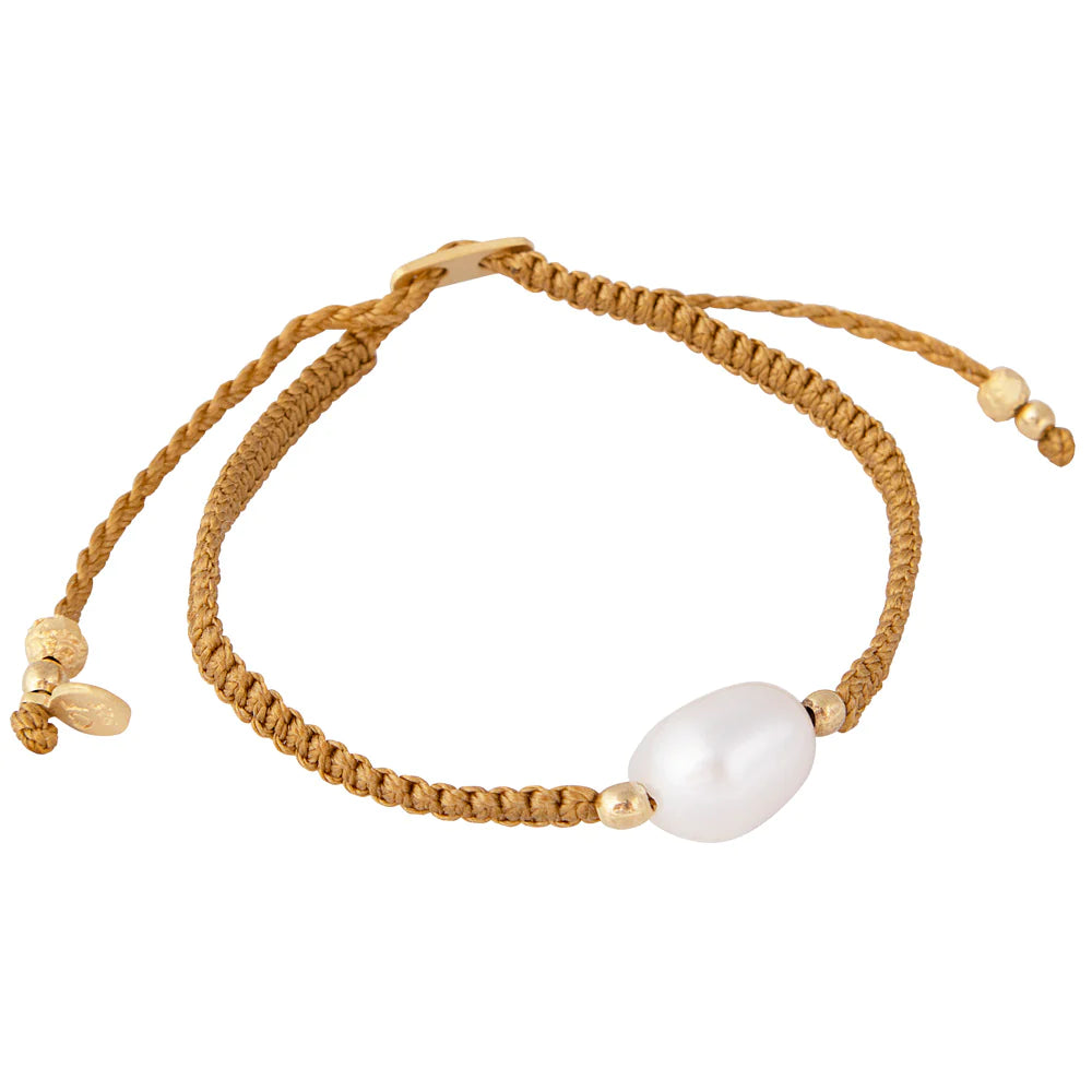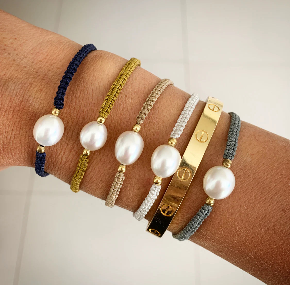 Add some candy to your arm with our best-selling freshwater pearl rope bracelet. Featuring freshwater pearl on sand cord with sterling silver 18k gold plate finishings.