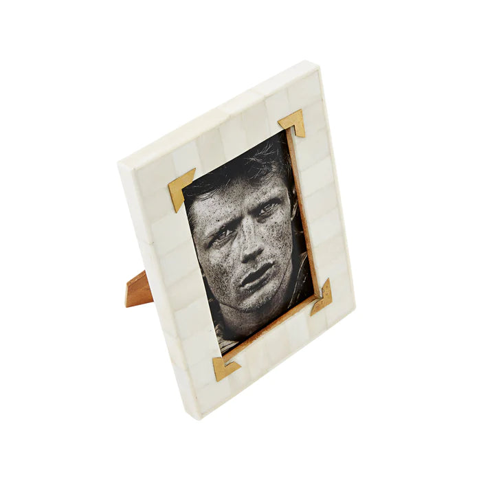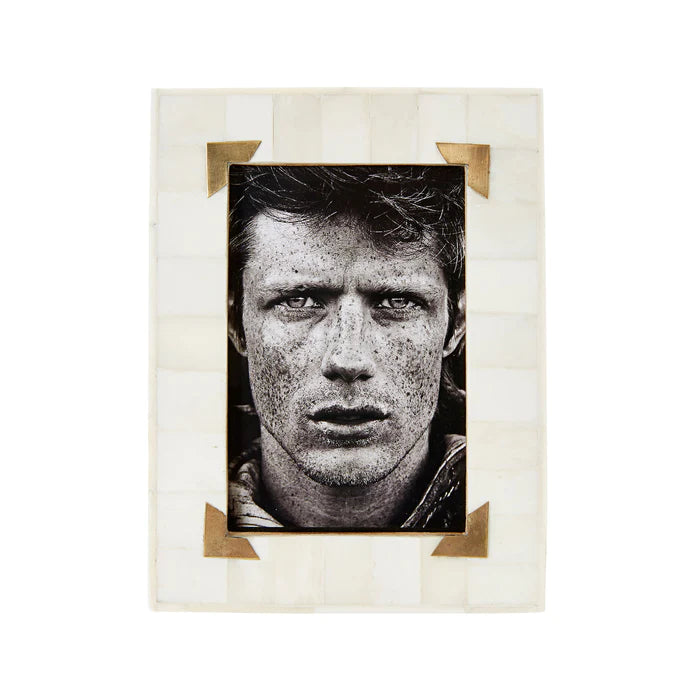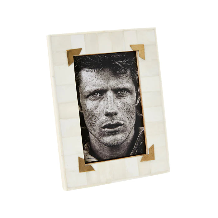 Bone frame with brass corner detail. Outer 20 x 15 x 1. Fits image size 4x6".