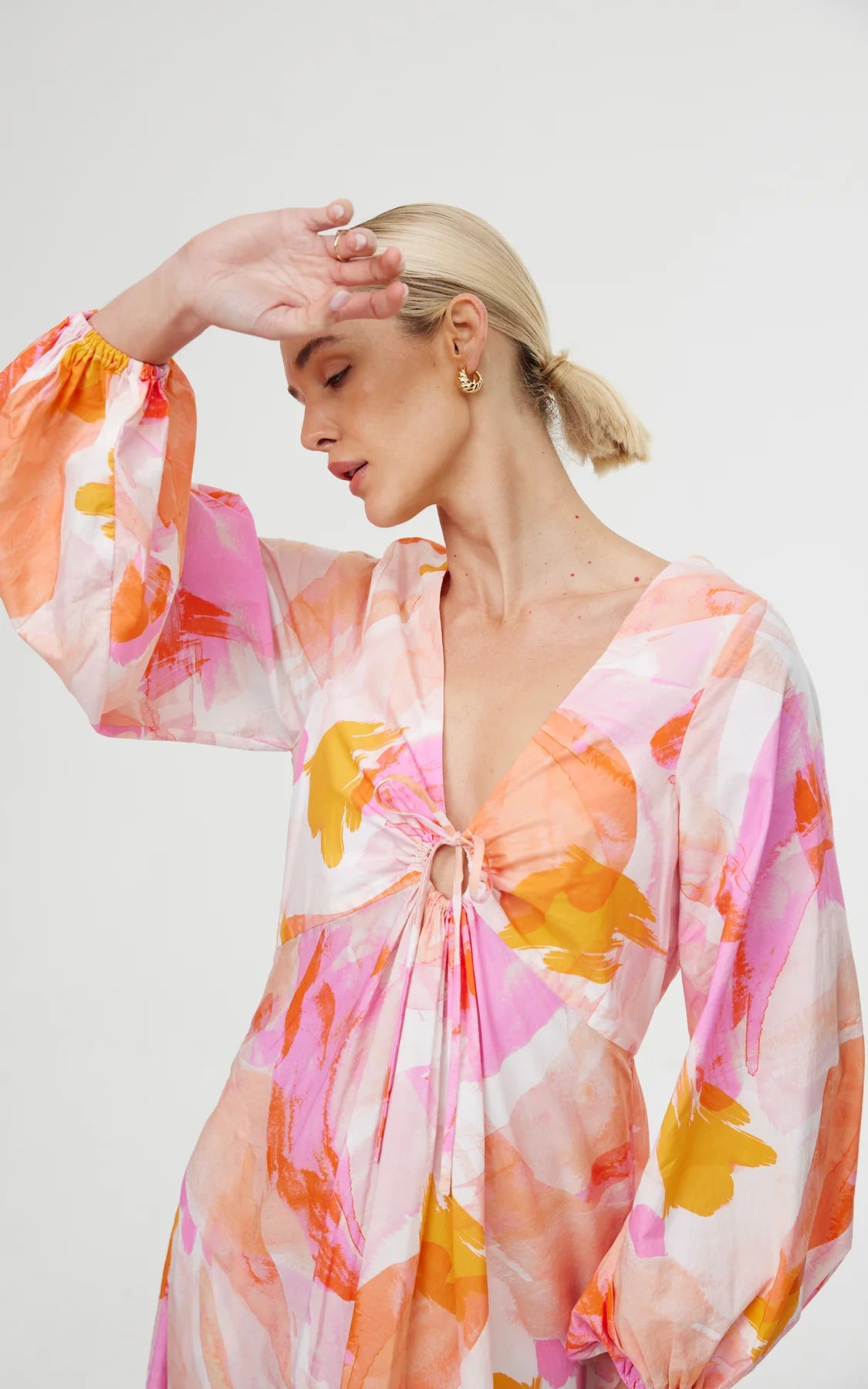 The Marais Dress is a long-sleeved maxi dress with a deep v-neckline. It features a gathered keyhole cutout that is adjustable with a tie. The sleeves are finished with gathered and elasticated cuffs. Some other details to note are the in-seam pockets, adjustable bow and wide hem finishing.