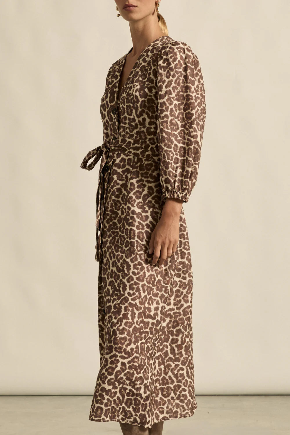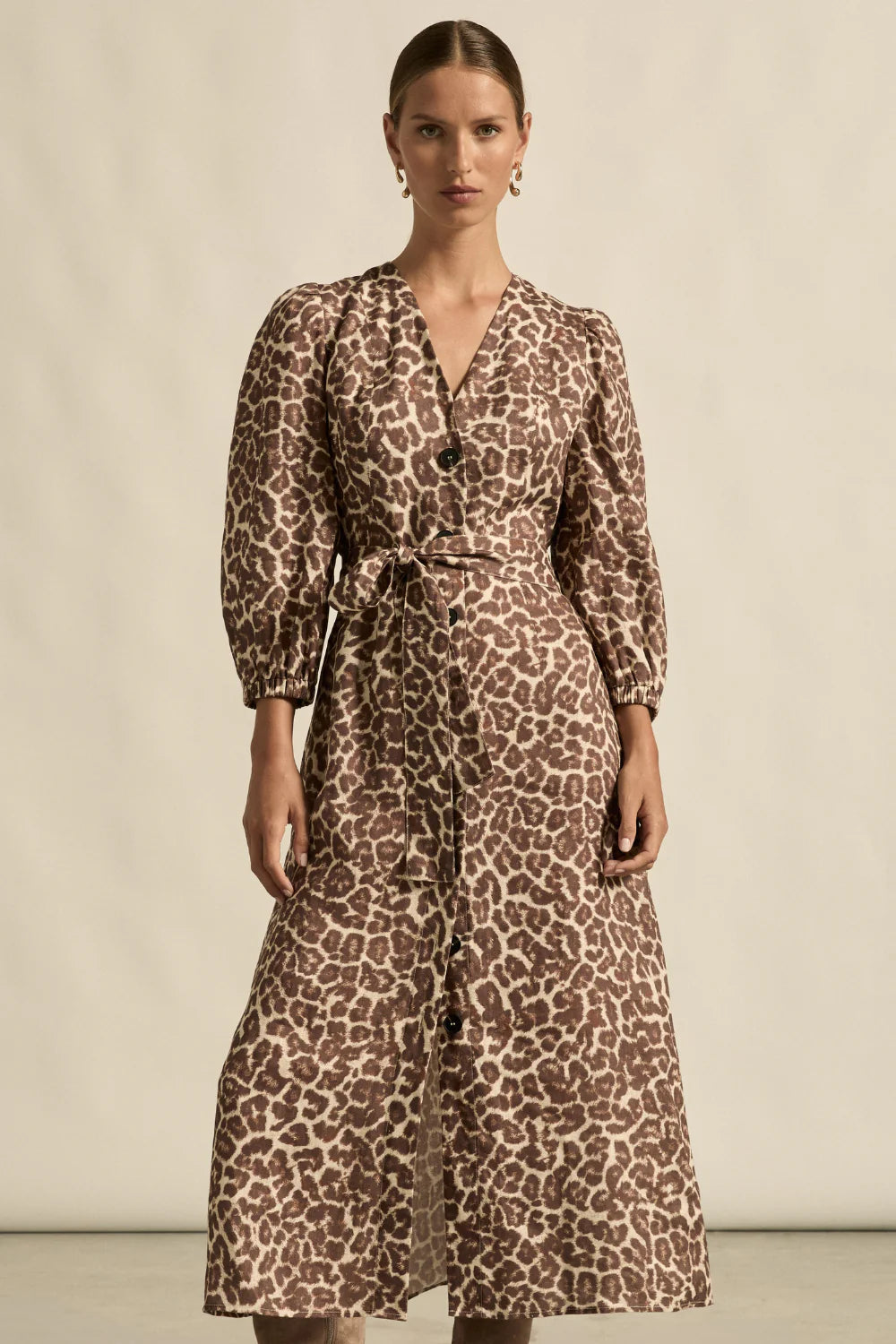 A modern interpretation of the leopard trend, the verge Dress in ocelot offers a neutral, wearable take on animal print. The button-through detail and V-neckline create a refined silhouette, while softly gathered sleeves and A line create a modern and flattering aesthetic.