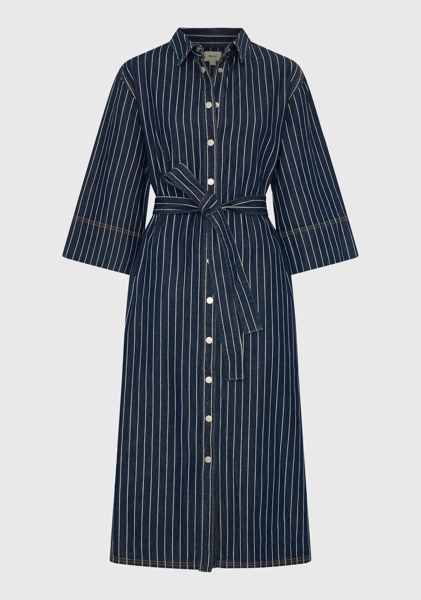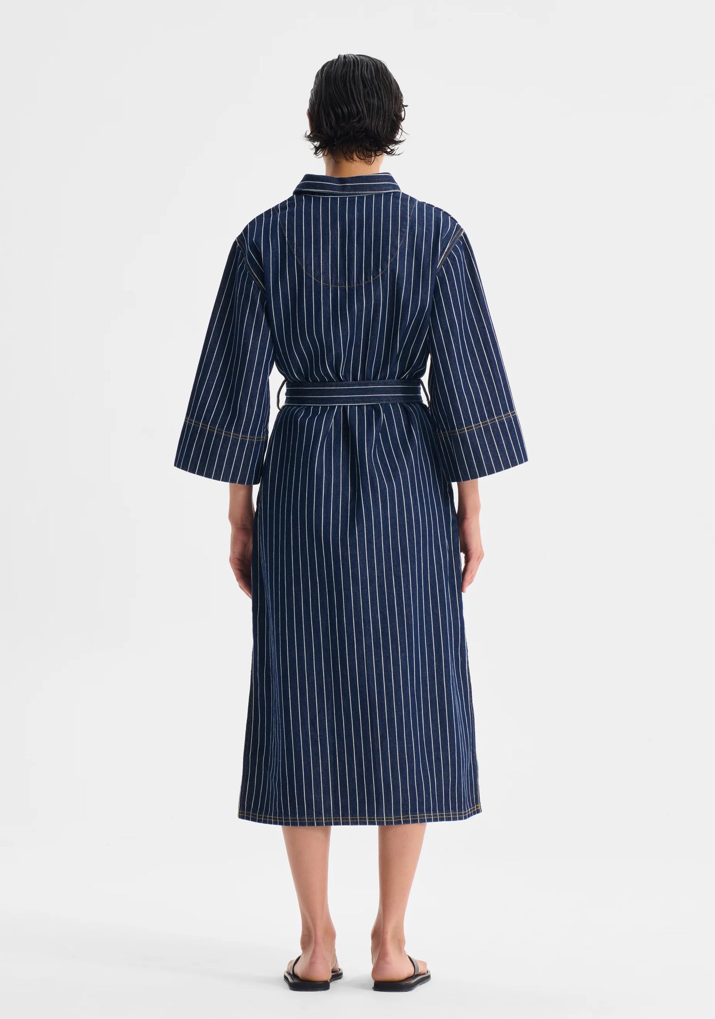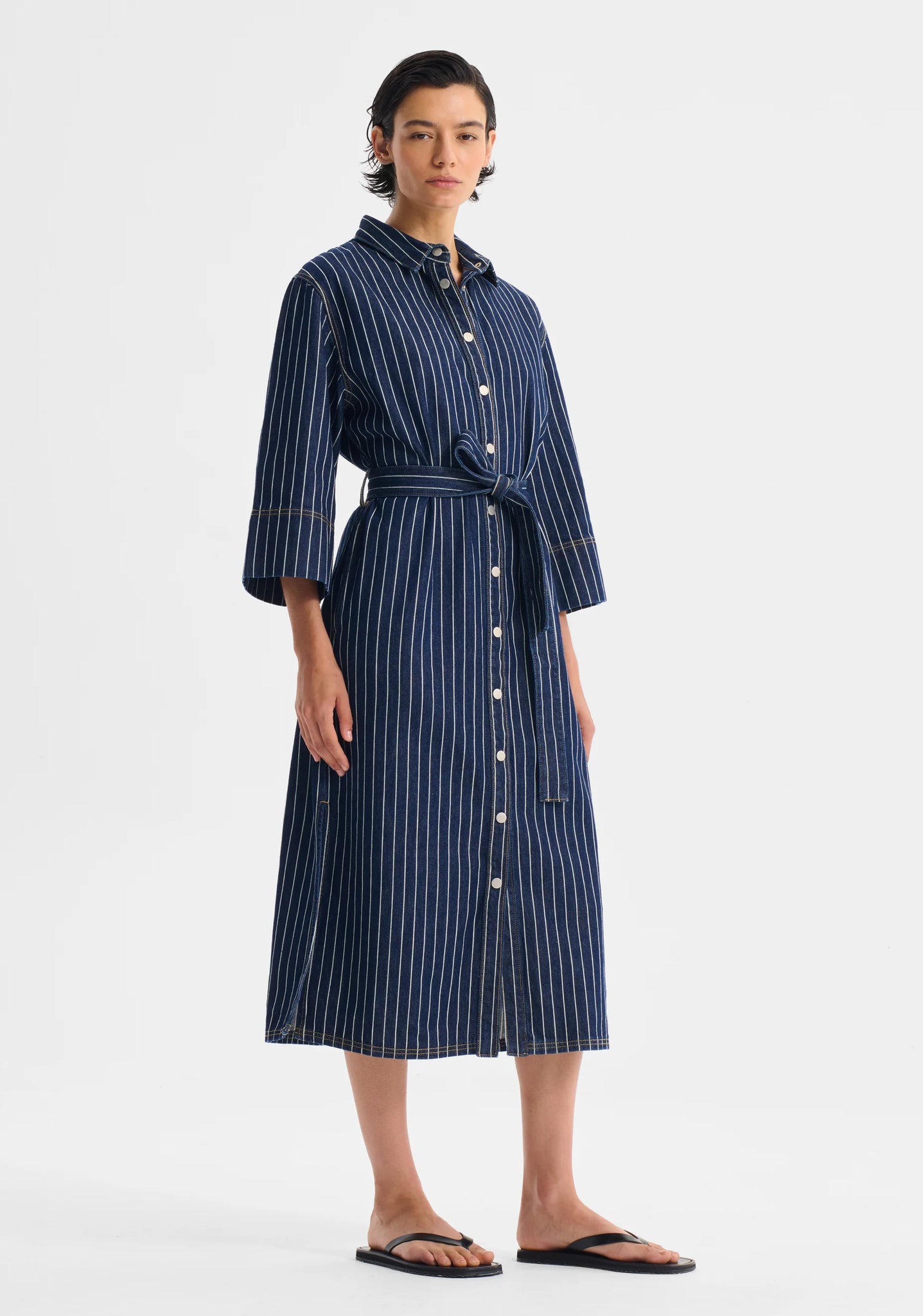Crafted from striped cotton denim, the Wyatt Dress features a traditional collar, metal snap front fastening, and dropped shoulders for a relaxed look. Designed with 3/4 length wide sleeves, side seam pockets, and side splits at the midi-length hem. Comes with a self-fabric belt to define the waist.
