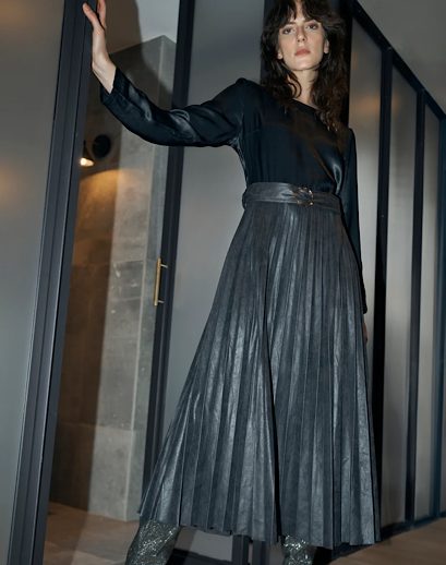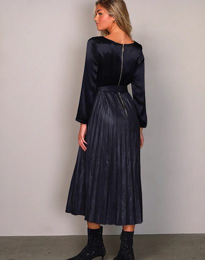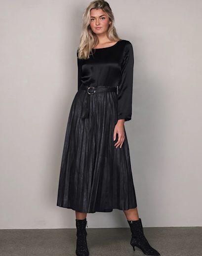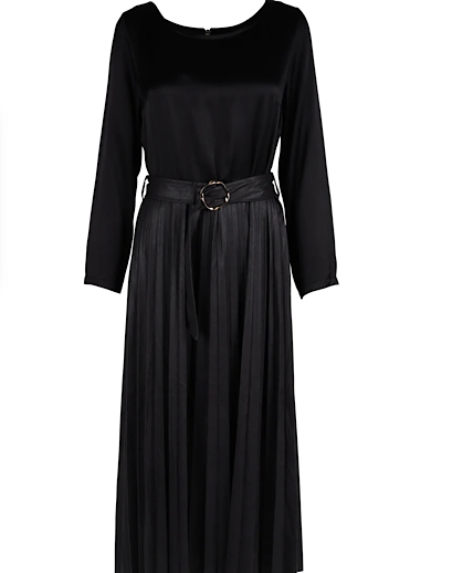Beautiful timeless dress that combines classic elegance with modern details. The long, pleated skirt and belt at the waist highlight a feminine silhouette, while the zipper at the back makes it easy to put on and take off. With its long sleeves and comfortable viscose material, the dress is suitable for both everyday wear and festive occasions.