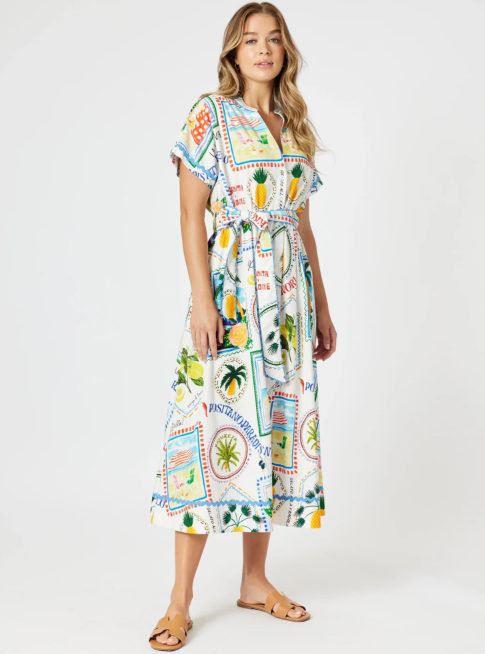 Featuring a vibrant Amalfi Coast–inspired postcard print, this dress celebrates sunny days with playful motifs of limes, palm trees, and seaside scenes.
