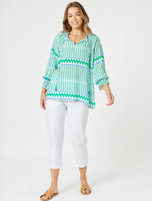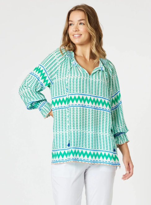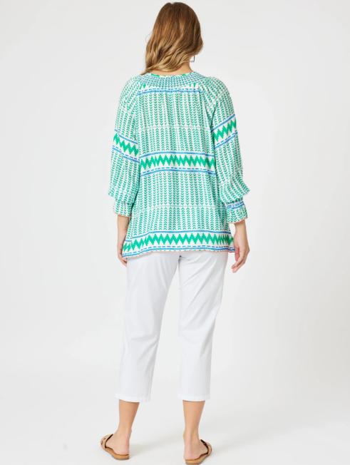 • The Geo Top features an eye-catching geometric print in pinks, oranges, and blues - bringing playful energy to an easy, everyday silhouette.