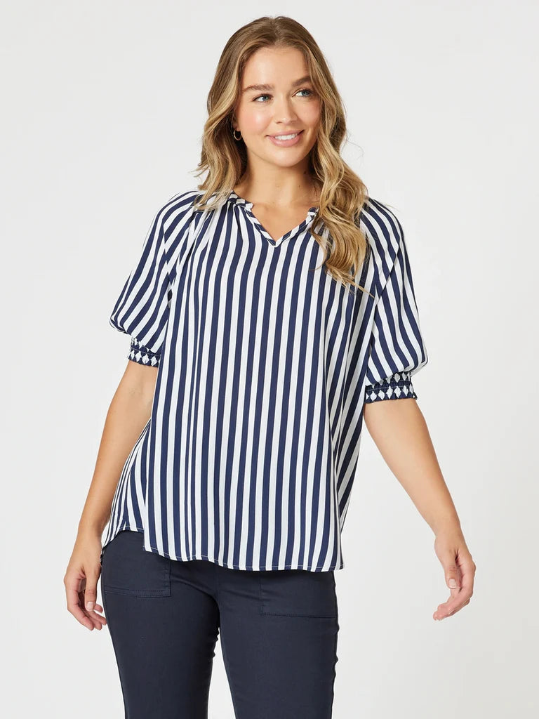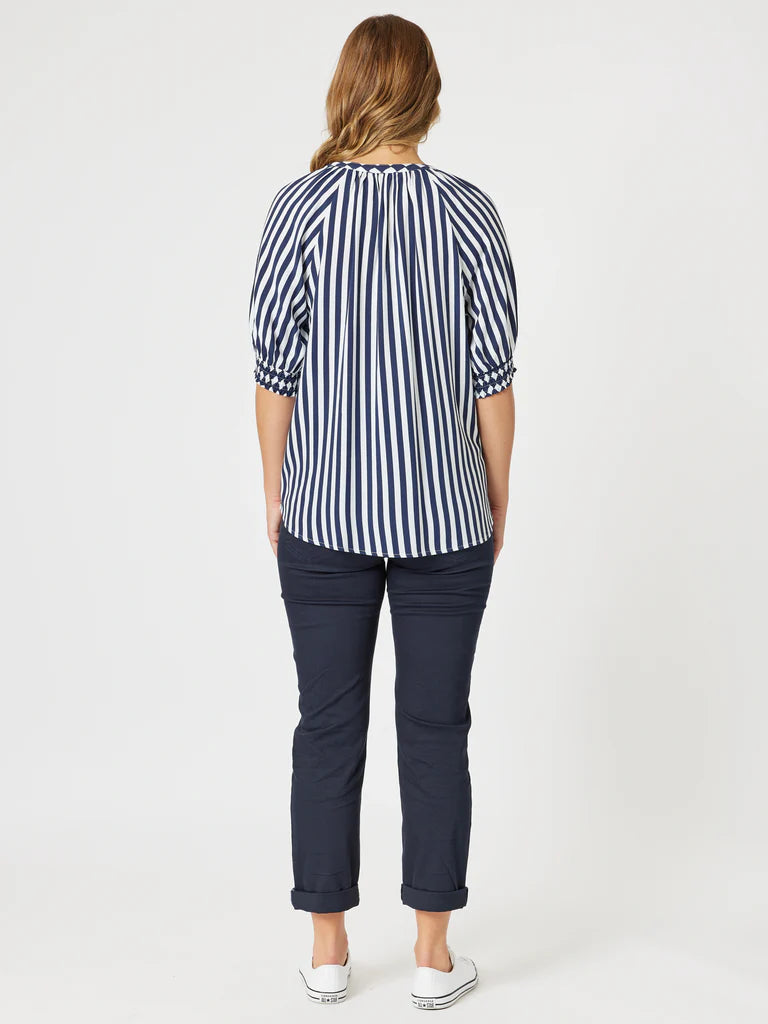 - Featuring bold navy and white vertical stripes, this relaxed-fit blouse is effortlessly chic.