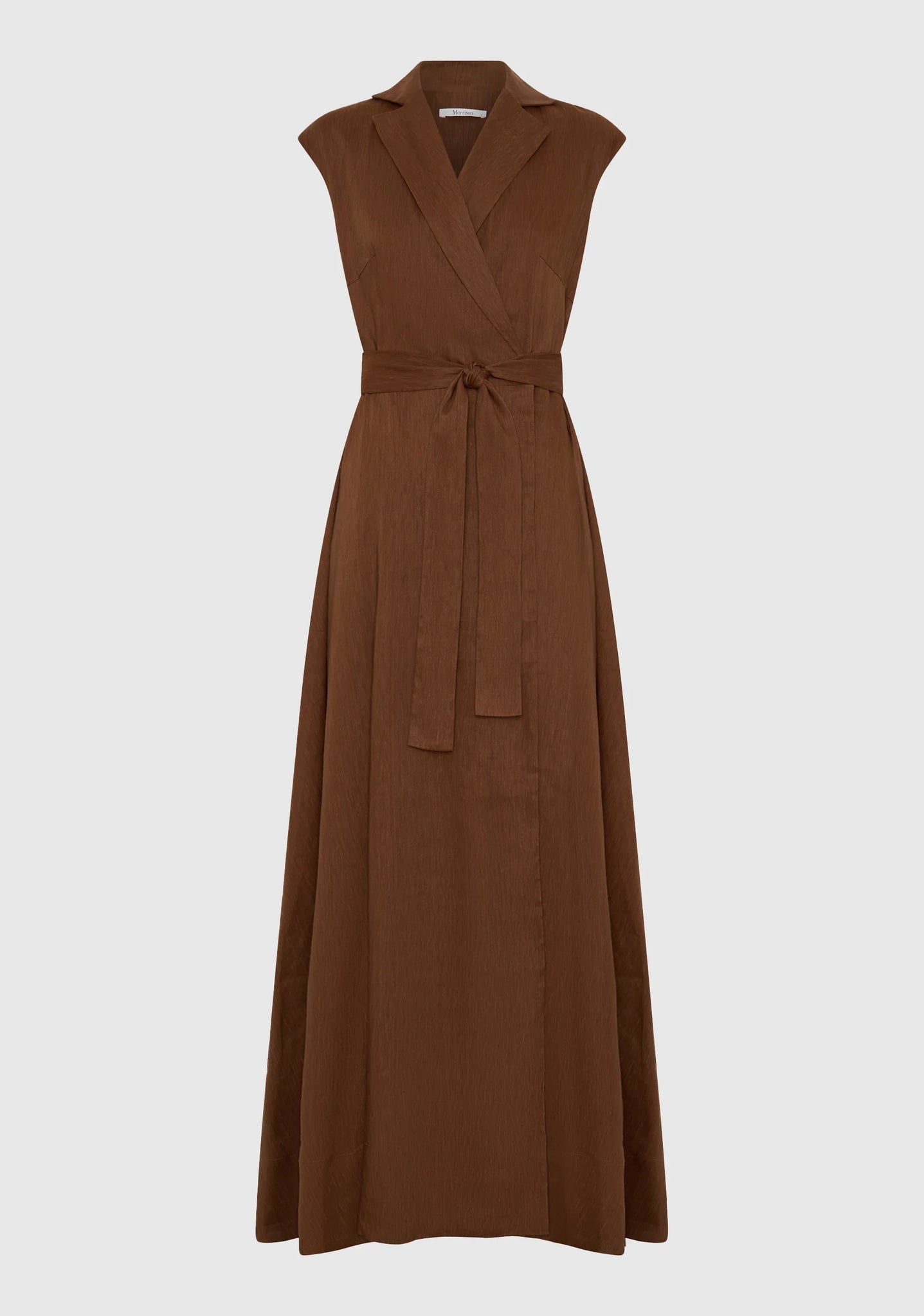 Crafted from a textured linen blend, the Vera Wrap Dress features a notched lapel collar and extended shoulders for a tailored touch. With internal and external waist ties, it cinches neatly at the waist before flowing into a full swing maxi silhouette, blending structure and ease effortlessly.