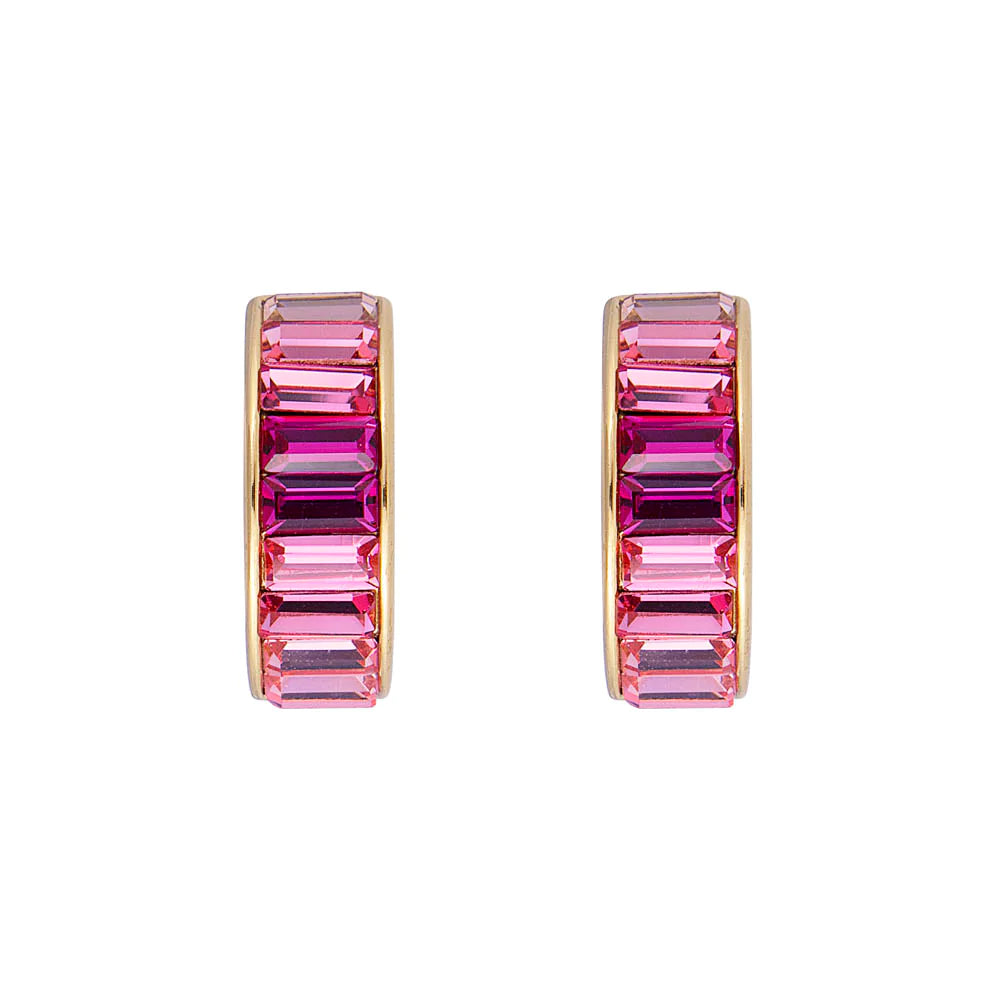 hese simply stunning hoops comprise pink baguette crystals in ombre design set in recycled sterling silver 18k gold plate. An elegant everyday extremely light weight hoop that will add a pop of colour to your outfit.