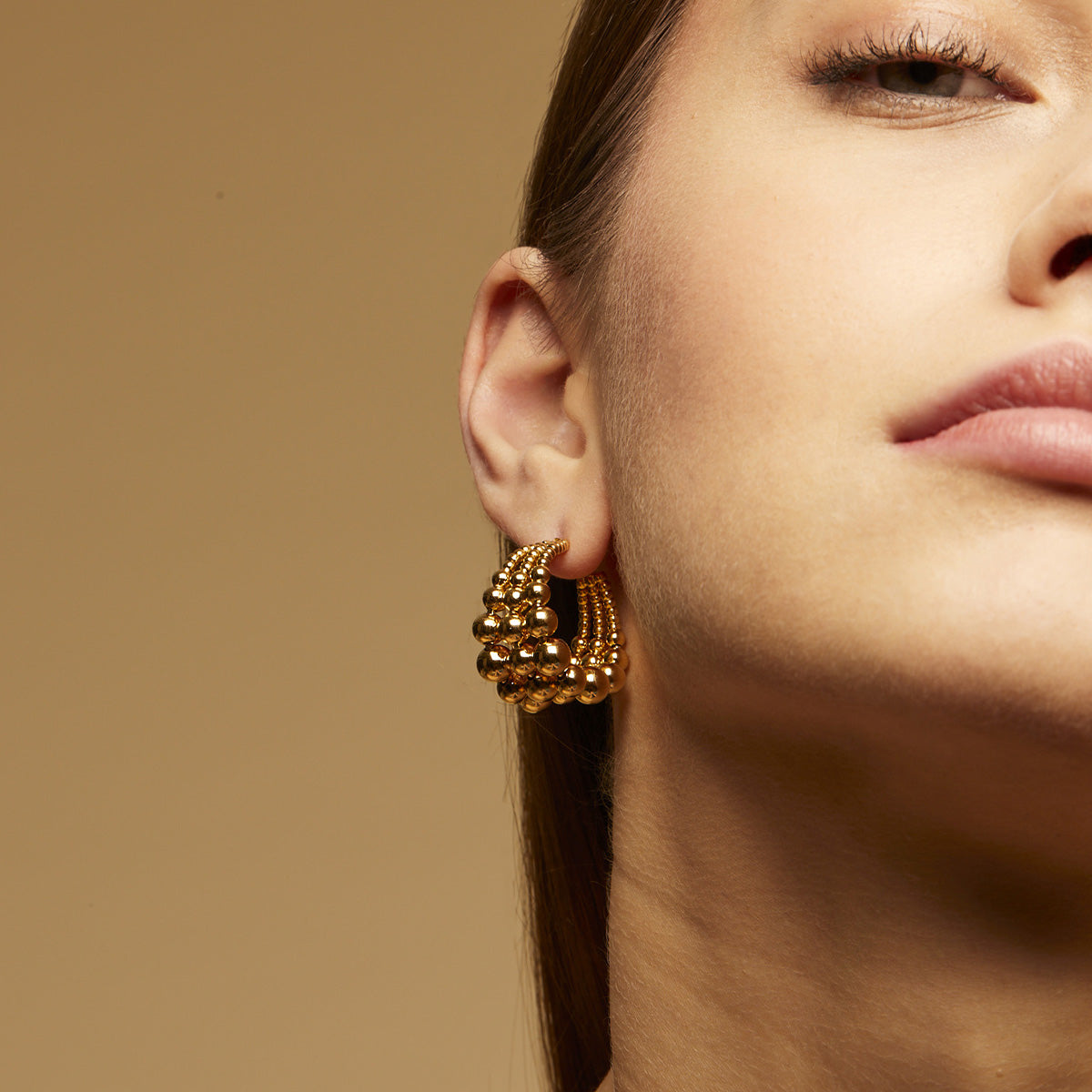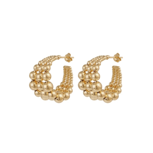 Gold plated hoop earrings composed of an assembly of pearls of different sizes.