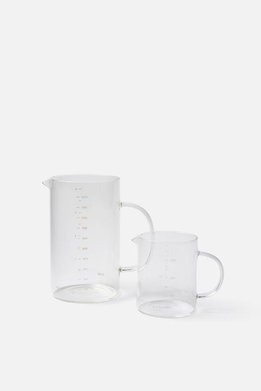 The practical clear glass jug is an ideal kitchen staple for measuring out recipes and storing utensils. Features measurement indicators up to 350ml in millilitres and cups. Made from thermal shock-resistant borosilicate glass.