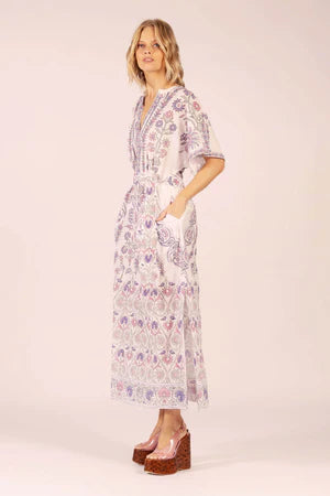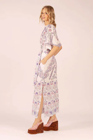 This 'Norman' dress exudes a feminine, bohemian charm, crafted from Lola Australia's signature cotton-voile 'Hindi' fabric with a unique digital print. Featuring a flattering v-neckline, an A-line silhouette that sweeps the floor, and side splits, it enhances every figure beautifully. The matching sash belt allows the waist to be cinched for a tailored fit, making it effortlessly elegant across all sizes.
