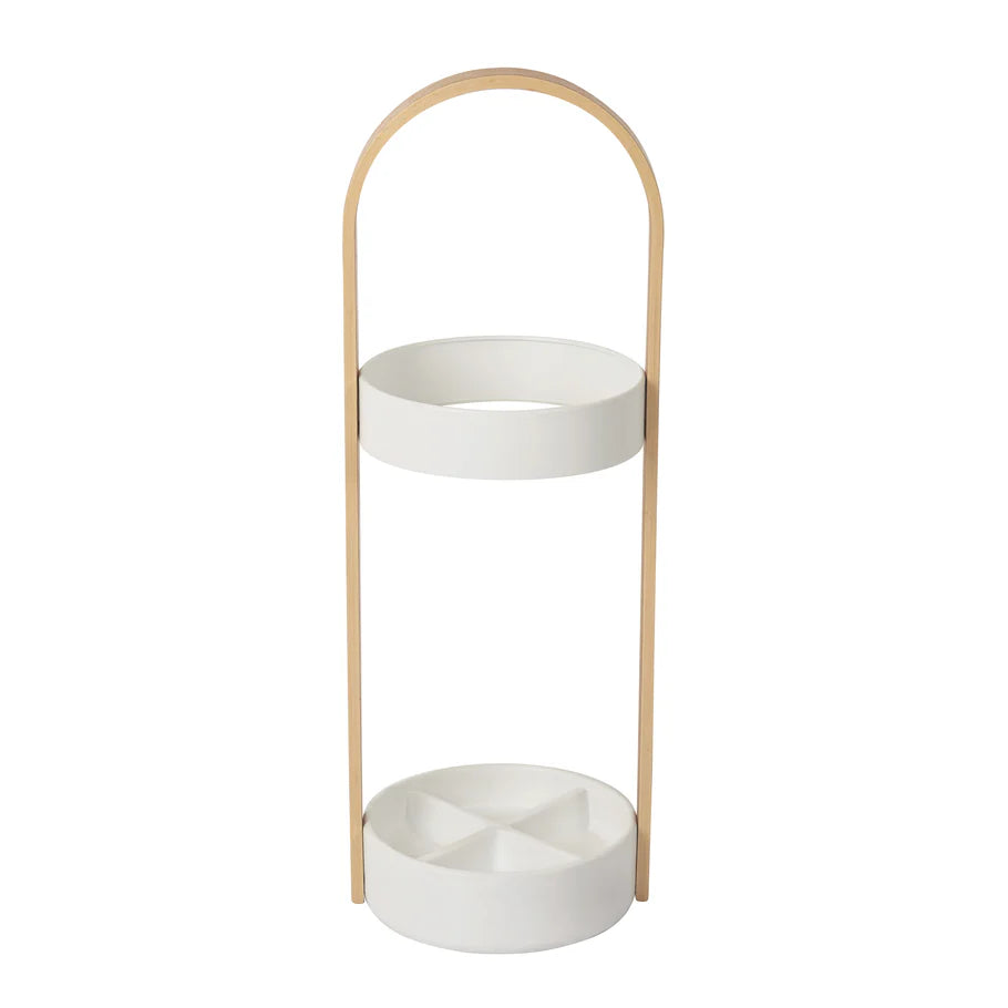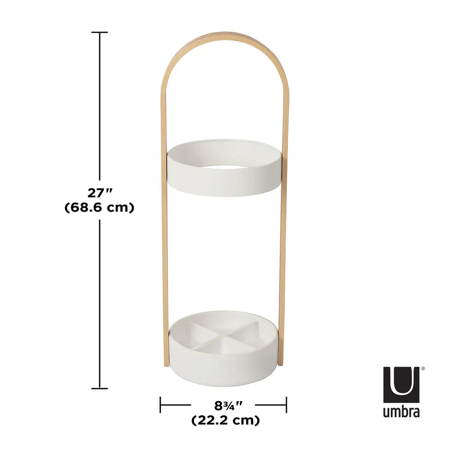 The Bellwood Umbrella Stand is durable as it is stylish thanks to its beautiful and shape and resin base, which is water-resistant and prevents rusting. Featuring a round base and a curved wood veneer handle with an upper ring made of steel. This piece is easy to assemble and includes all hardware. Its slots will hold your tall umbrellas with ease and its tiny hooks on the top of the ring will hold your more compact, short umbrellas. Measuring 22 x 68 cm, this stylish piece will fit neatly into many different spaces and styles of décor.