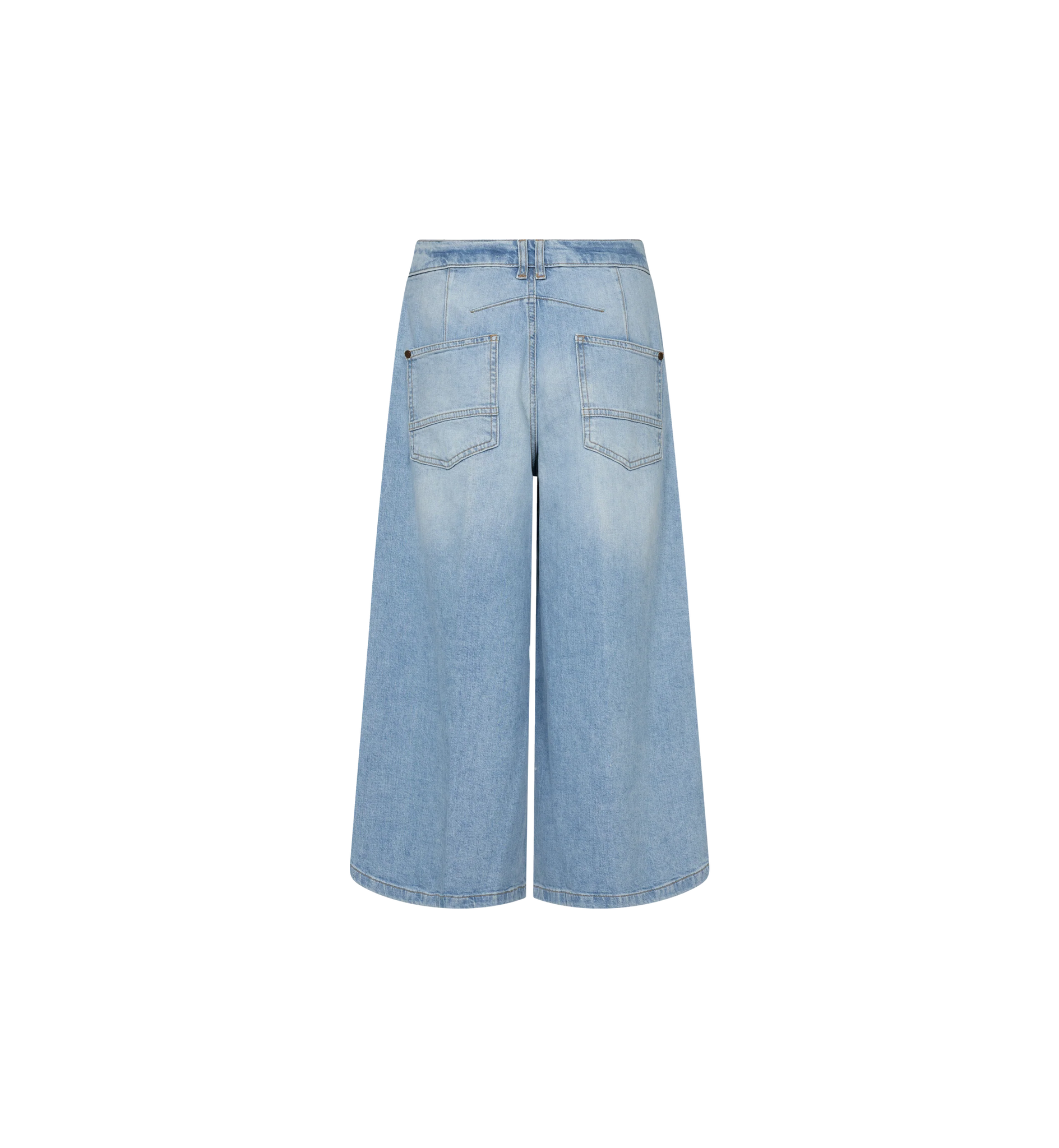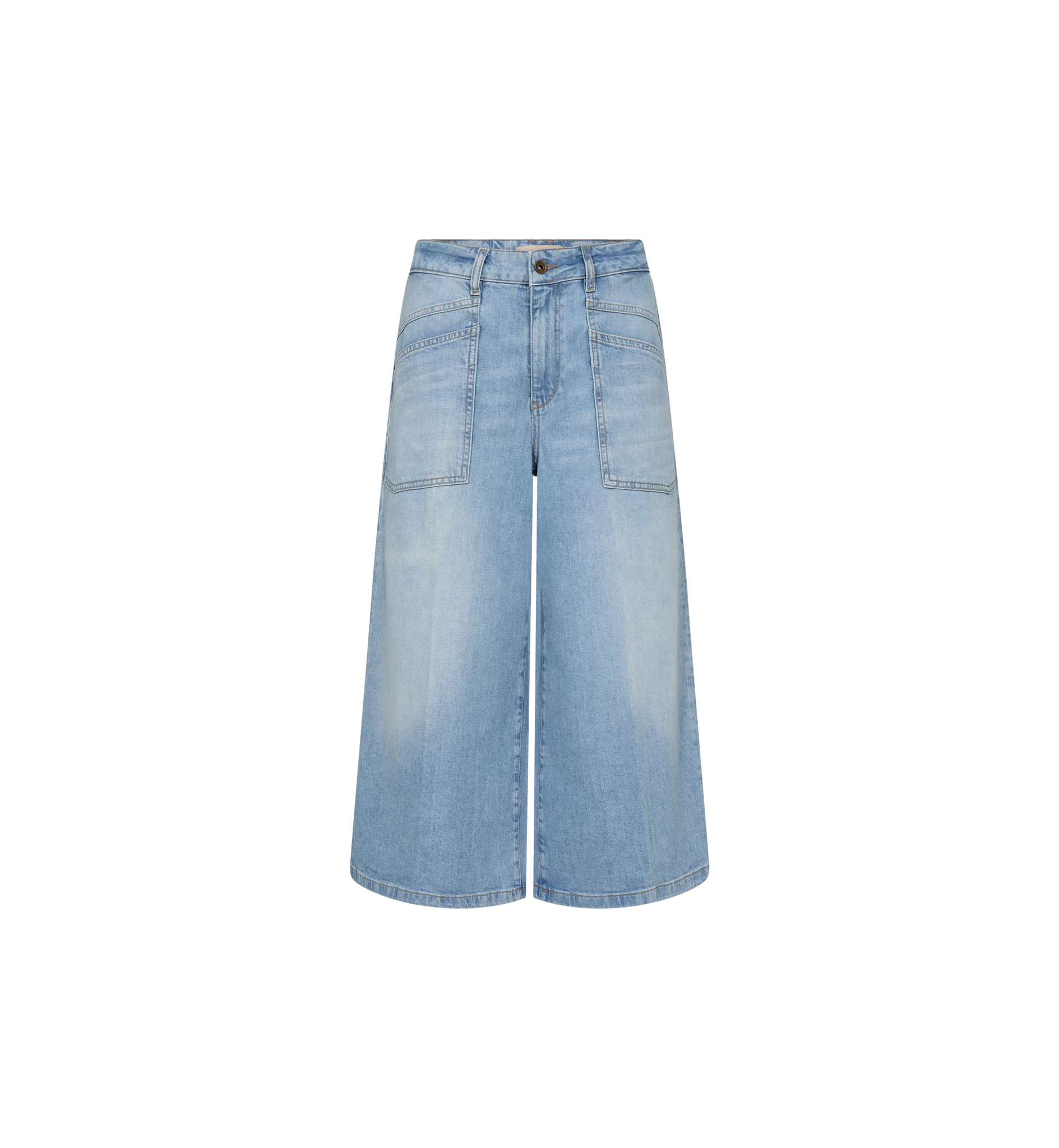 These statement-making culotte-style jeans bring a fresh and daring twist to traditional denim. Crafted with a flattering high-rise waist and a bold wide-leg silhouette, they exude confidence and contemporary flair. Oversized patch pockets on the front and back lend a utility edge, perfectly balanced by the light blue wash that radiates a crisp and modern feel. Whether paired with a tucked-in blouse for a polished touch or a cropped top for a playful, fashion-forward vibe, these jeans are a versatile and striking addition to any wardrobe.
