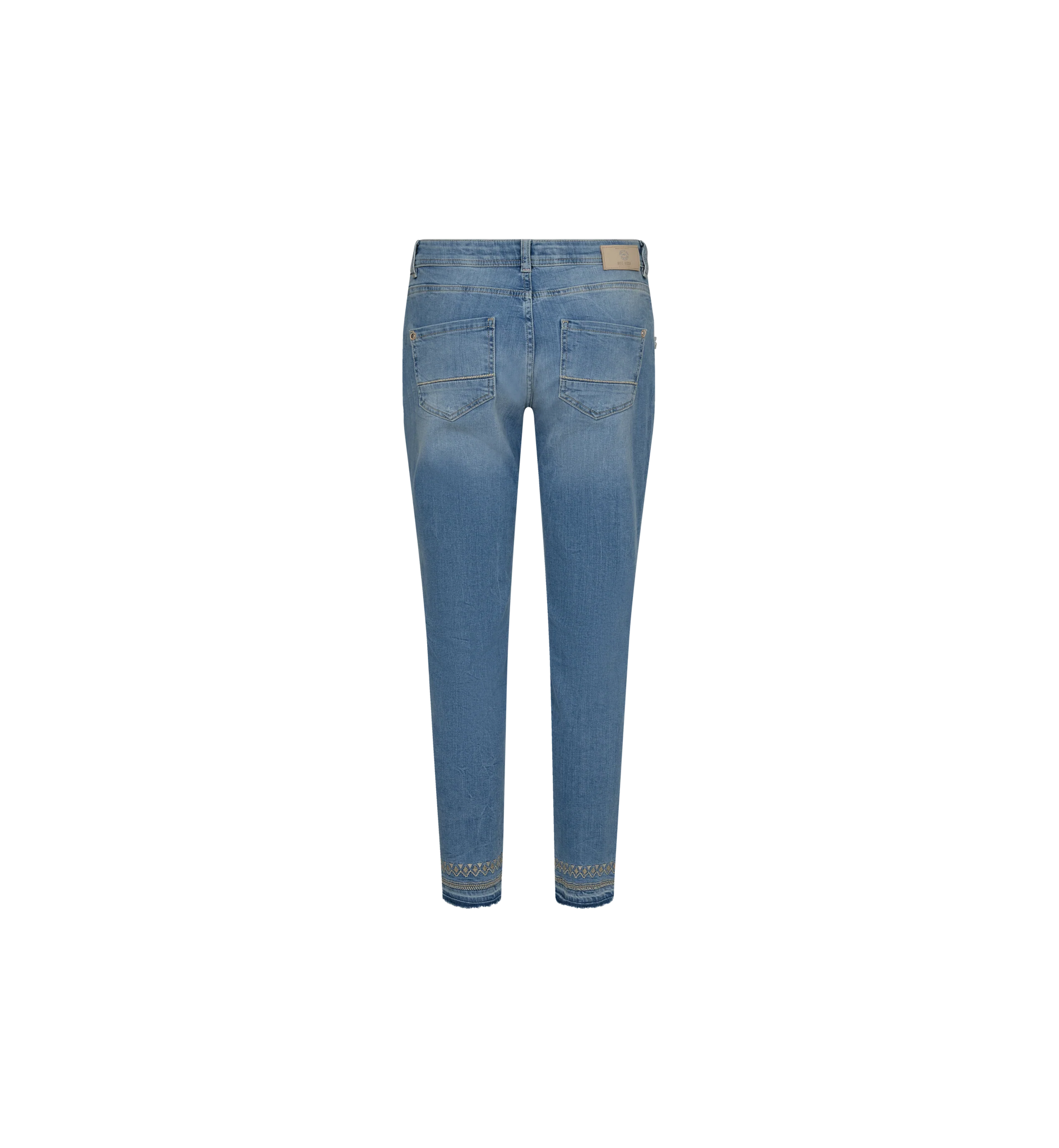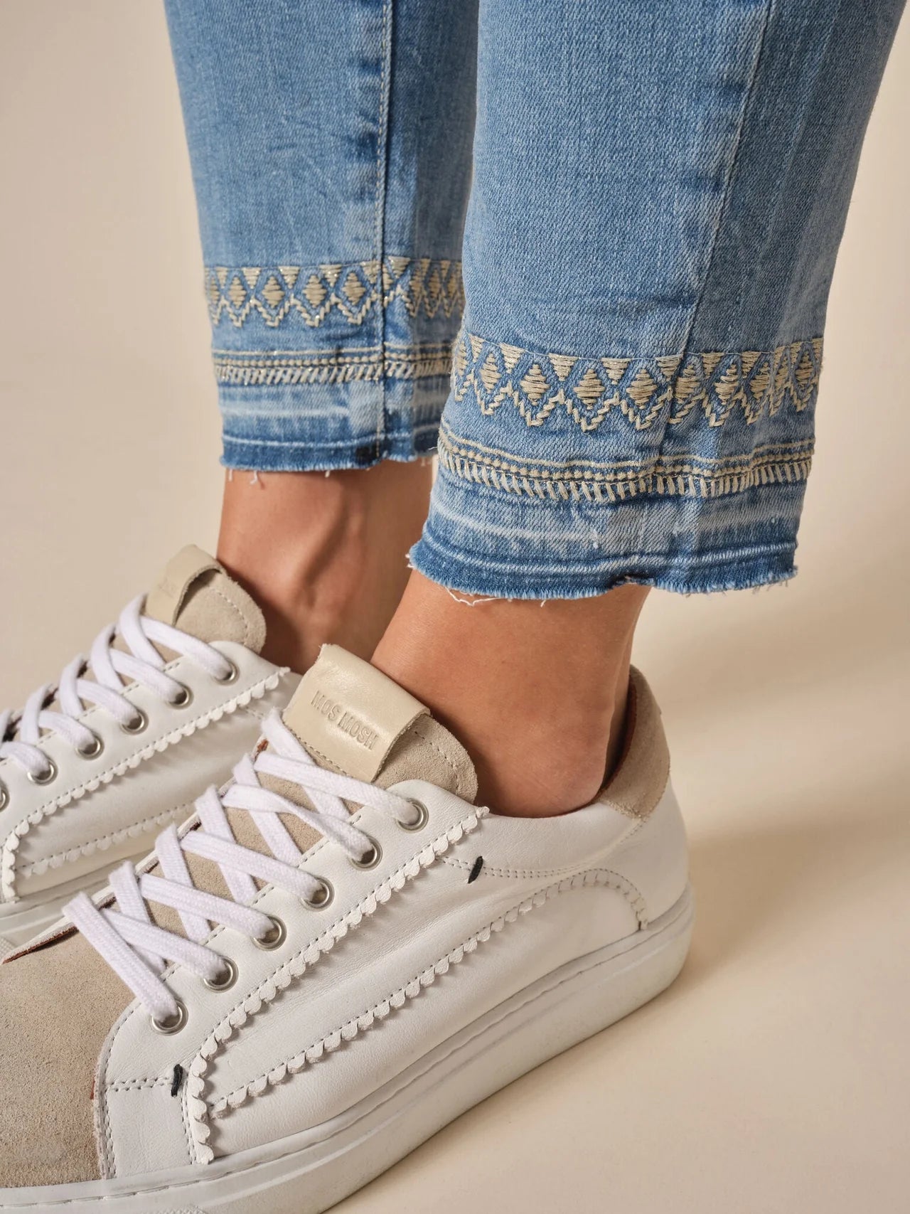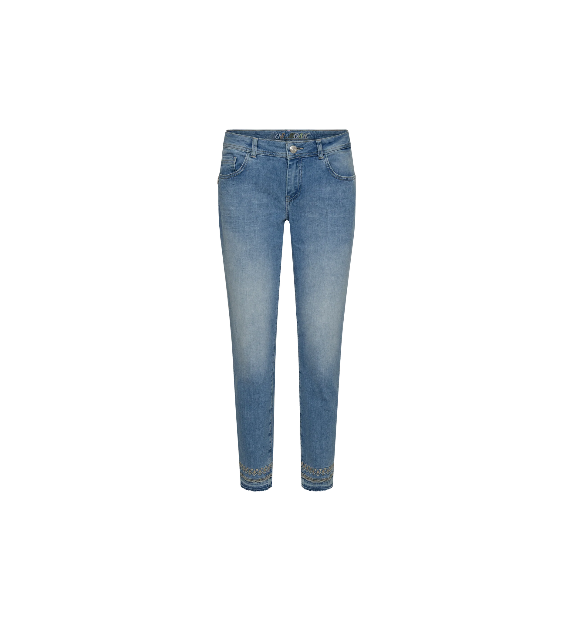 Mos Mosh jeans designed with a slim fit, low rise, and ankle length, these jeans are crafted from comfortable cotton with stretch, perfect for all-day wear. The jeans feature subtle destroyed details and a raw hem decorated with stitching and lurex.