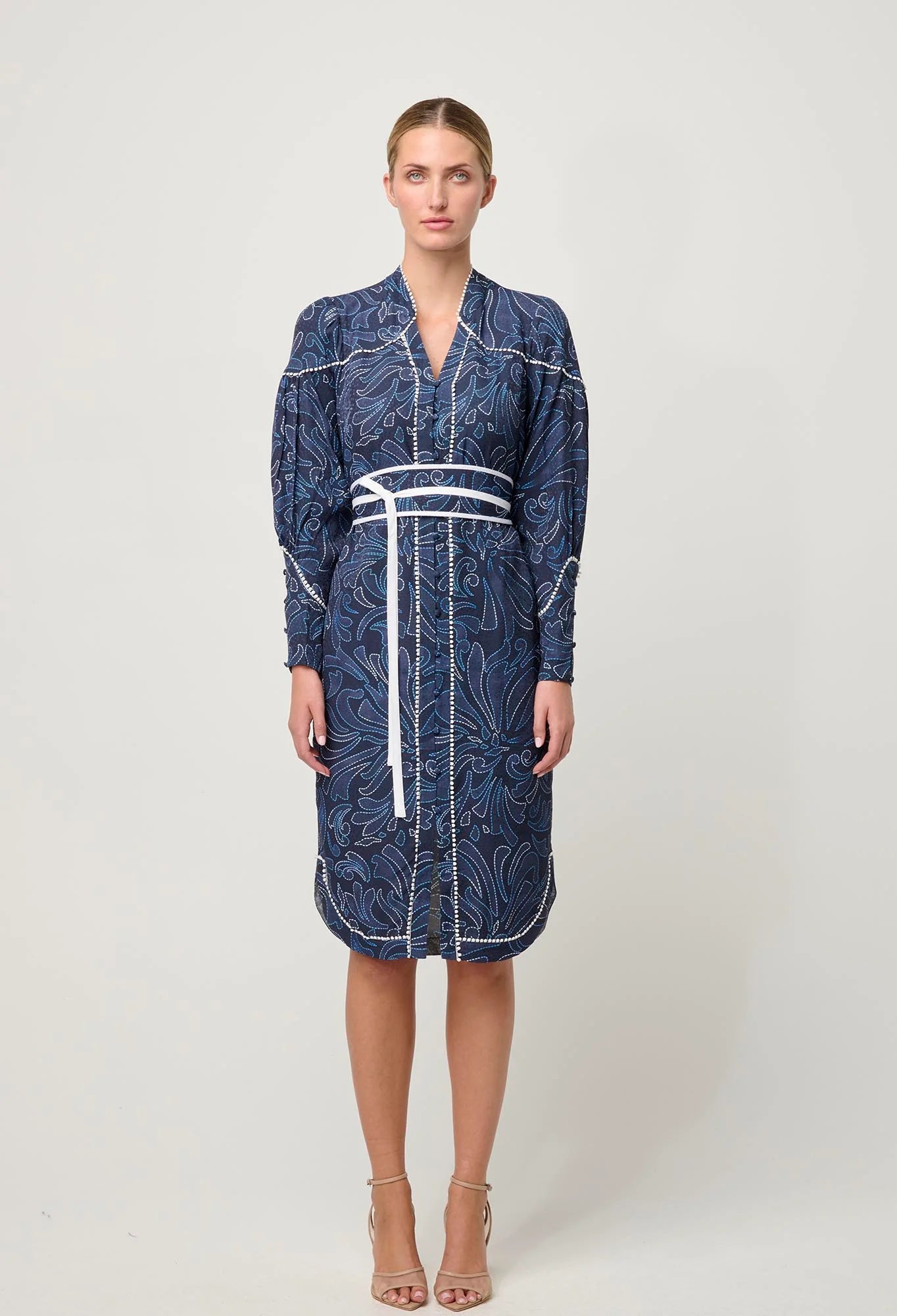 Crafted from lightweight viscose dobby, the Adela Dress drapes beautifully, offering breathable comfort and fluid motion. Intricate contrast lace trims highlight the sculptural puff sleeves, tailored bodice, and curved hem, adding a touch of delicate refinement. The deep V-neckline and adjustable waist ties create a flattering silhouette, making this piece a statement of contemporary romance.