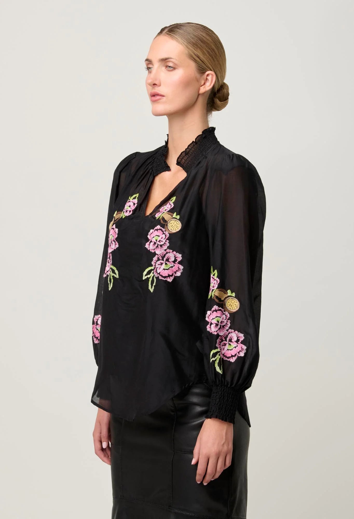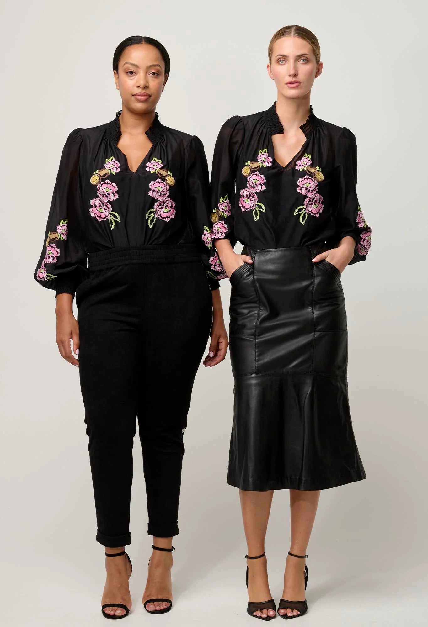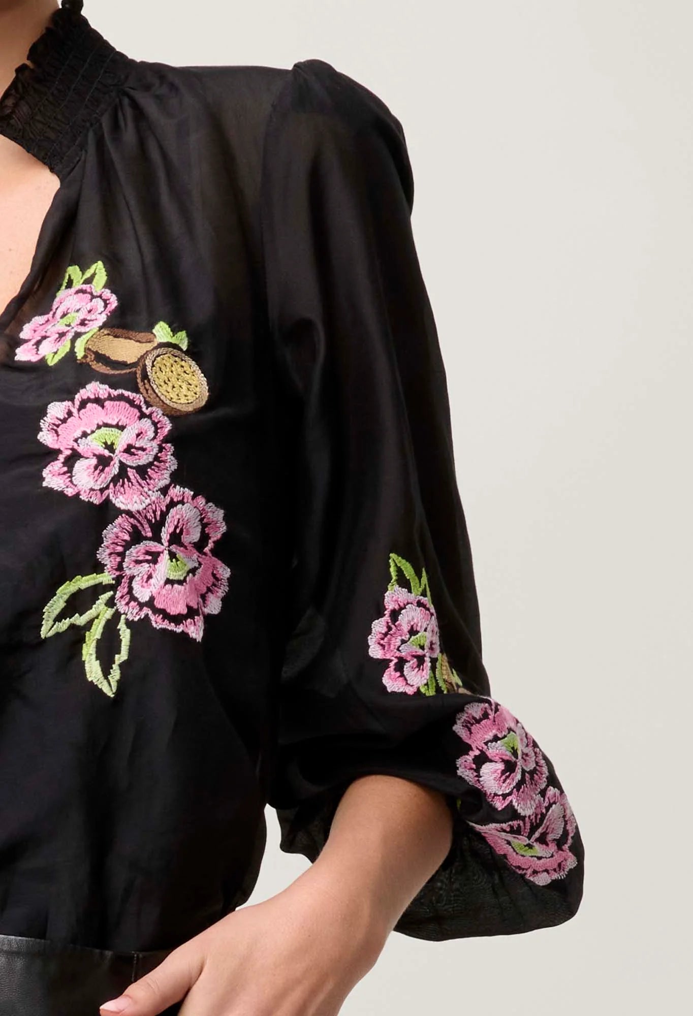 Timeless elegance meets artisanal craftsmanship in the Catalina Embroidered Cotton Silk Blouse in Black Flores. Designed for the modern woman who embraces sophisticated femininity, this blouse is a perfect balance of romantic detail and effortless wearability.
