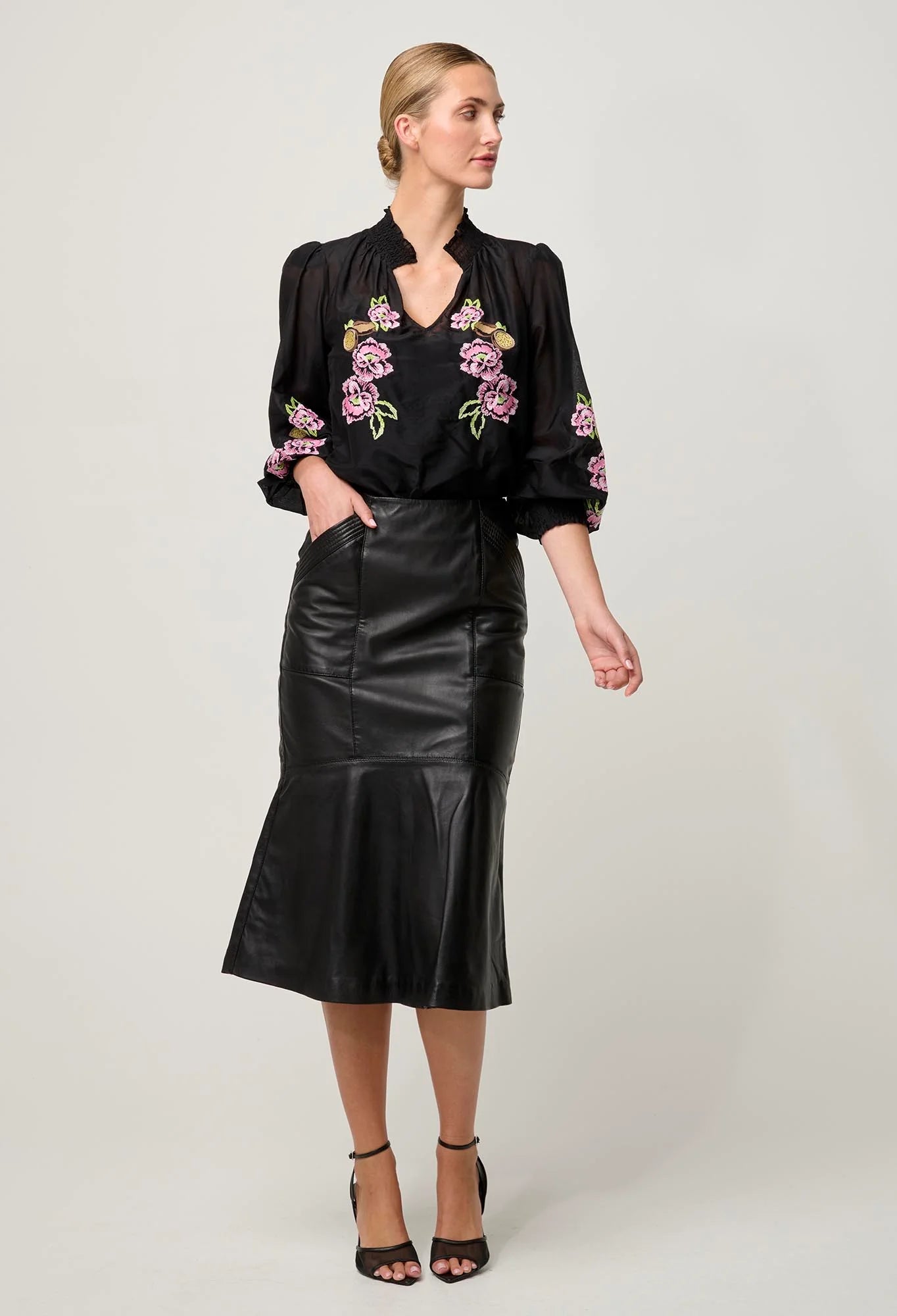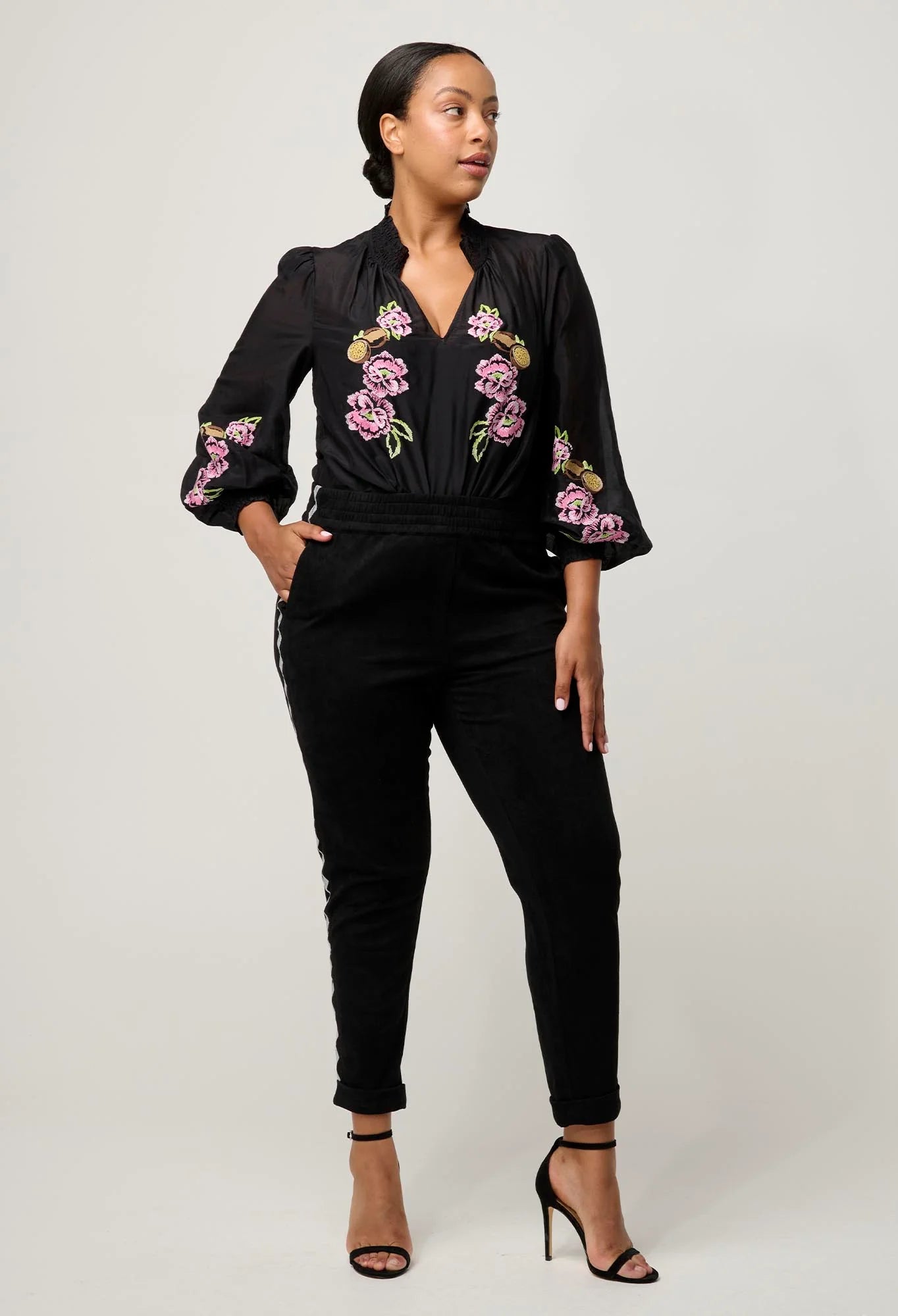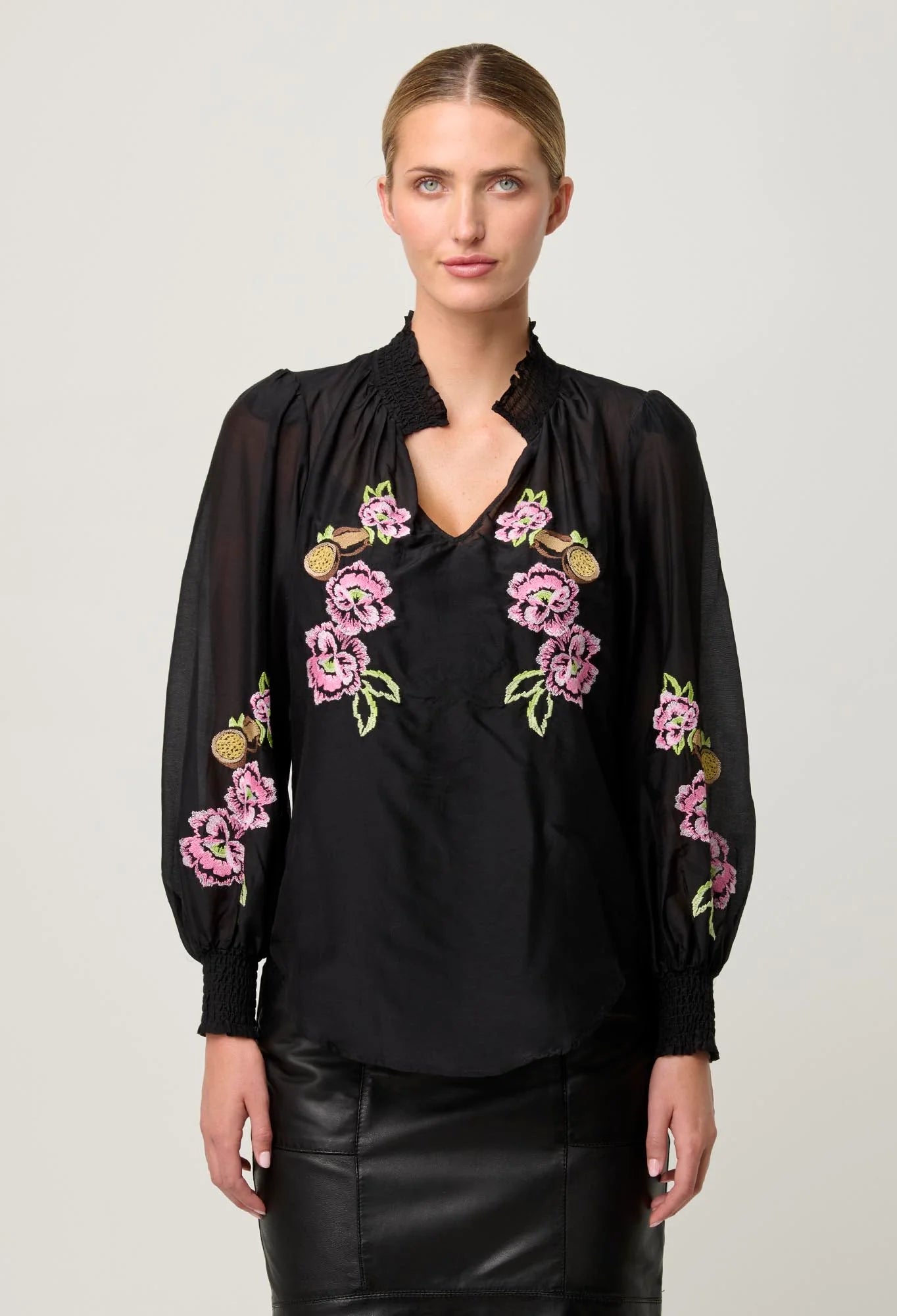 Timeless elegance meets artisanal craftsmanship in the Catalina Embroidered Cotton Silk Blouse in Black Flores. Designed for the modern woman who embraces sophisticated femininity, this blouse is a perfect balance of romantic detail and effortless wearability.