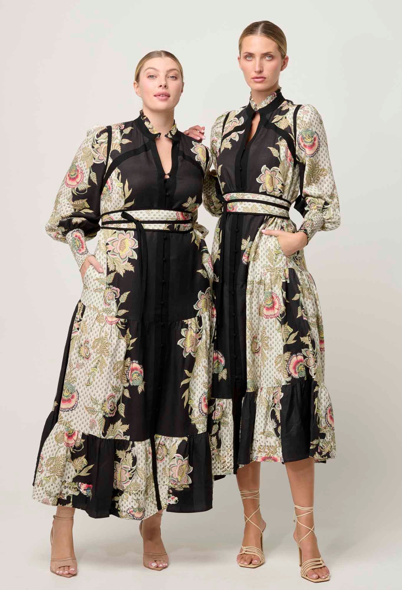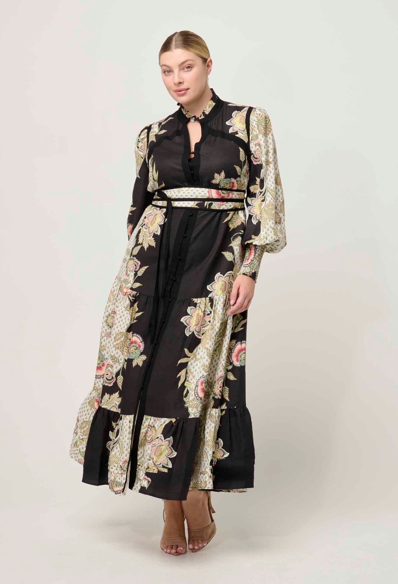 Crafted from a luxurious linen viscose blend, this dress drapes beautifully while offering breathability and comfort. The striking Mariposa Nero print, inspired by vintage botanical motifs, creates an air of mystique and wanderlust. A deep V-neckline, billowing sleeves, and a detachable waist belt add shape and definition, allowing for a customised fit that accentuates your silhouette.