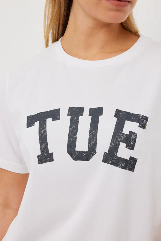 Everyone’s favourite tee! A repeat best-seller, our band tees have become essential wardrobe additions. This new design brings street style edge with our cool new TUE logo. Printed on our signature heavier-weight cotton (making it a staple year-rounder), this style is not your average tee shirt! Designed to feel confident and edgy, she looks great with a blazer layered over top too.
