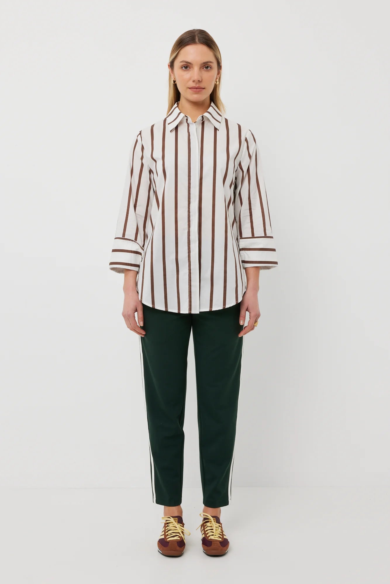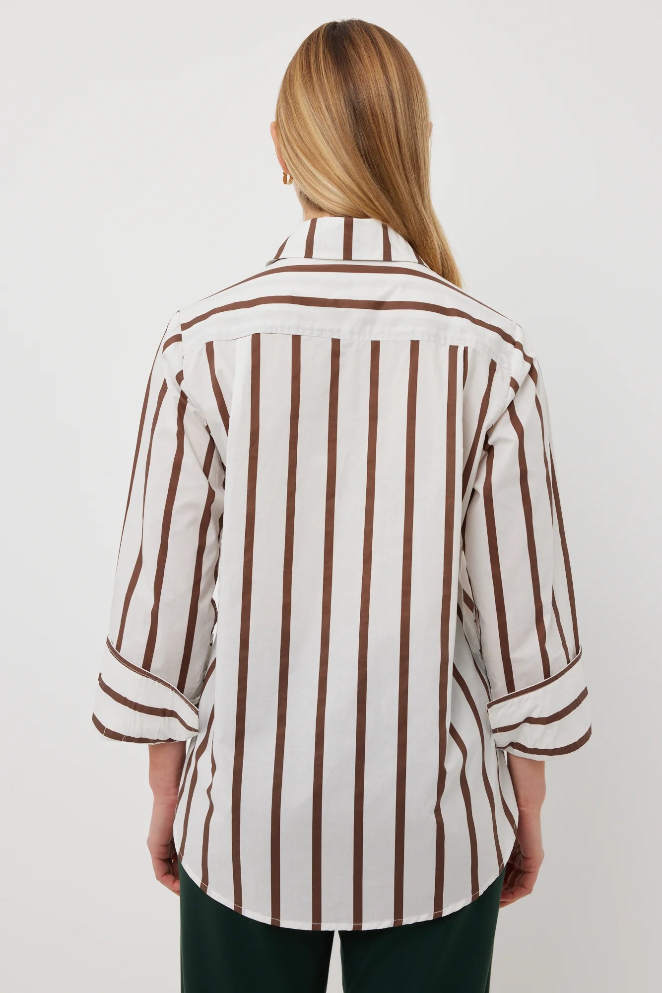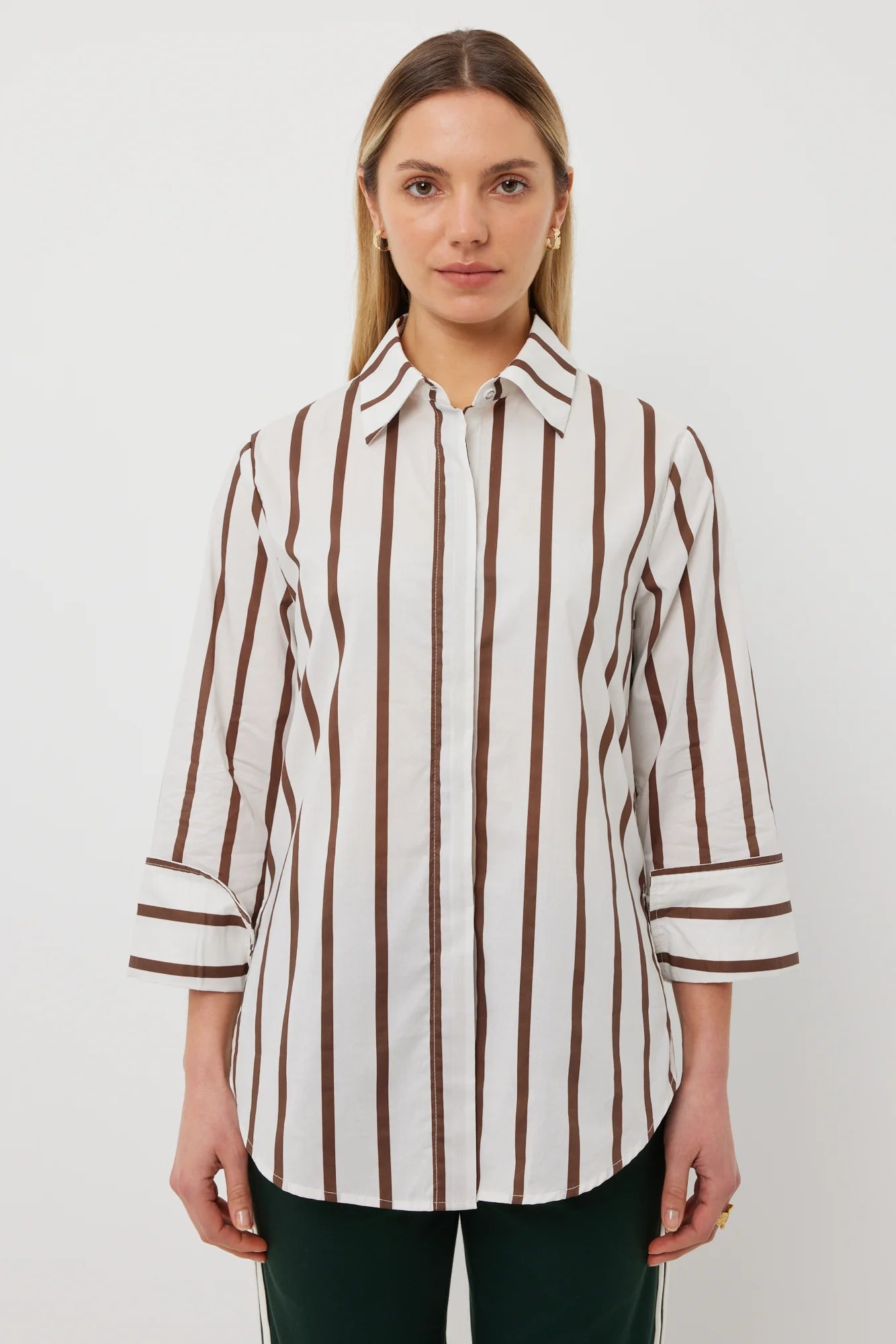 Our much-loved classic shirt with the modern update of an extra-wide feature cuff. Blending timeless looks with stand-out detail, this shirt will be a forever fave and in the new-season chocolate stripe this piece will make you feel confident and fashionable. Add to your workwear wardrobe, or simply team with denim for a fresh, on-trend outfit.