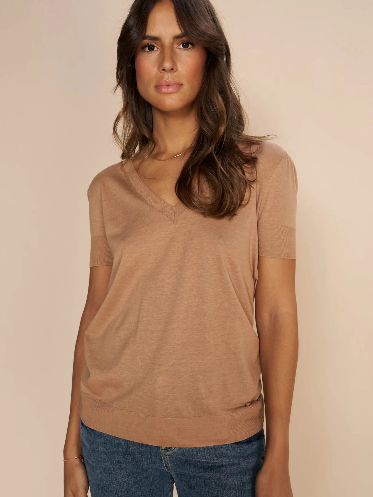Embrace timeless elegance with this tee, designed in a slightly fitted silhouette that accentuates your form. The v-neckline is both flattering and refined, complemented by the delicate pleats at the shoulders. Finished with rib details at the neckline, cuffs, and hem, this versatile piece pairs effortlessly with jeans or shorts for a chic and comfortable ensemble.