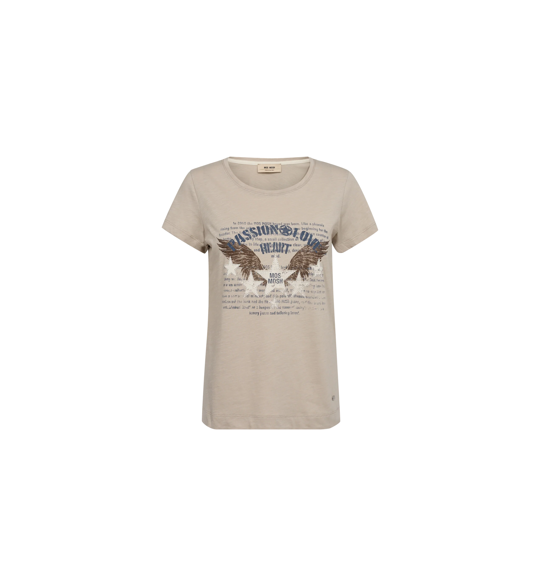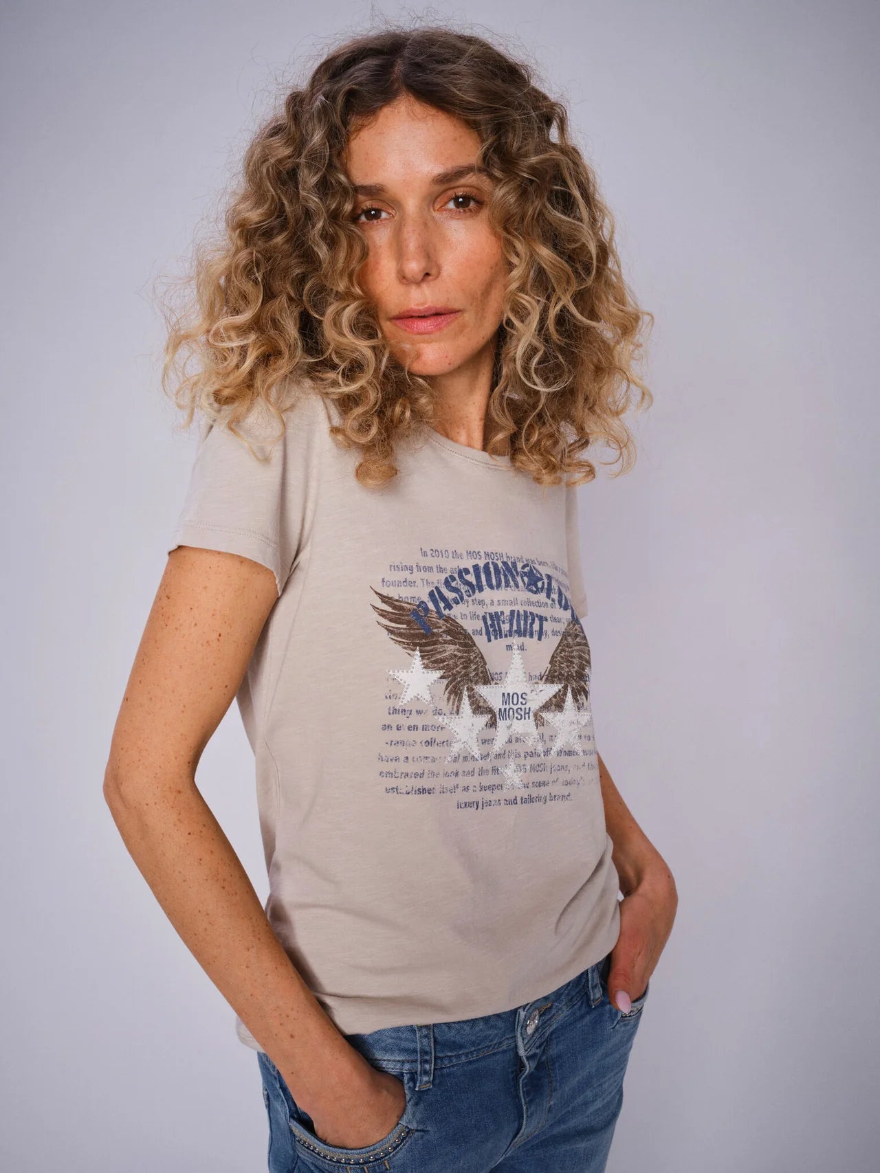 Channel American vintage vibes with this fitted organic cotton tee, featuring a MOS MOSH logo print complete with stars, wings, and brand story details. The distressed print gives it a rock 'n roll edge. Style it with vintage-wash jeans and a bomber jacket for the perfect retro-inspired look.