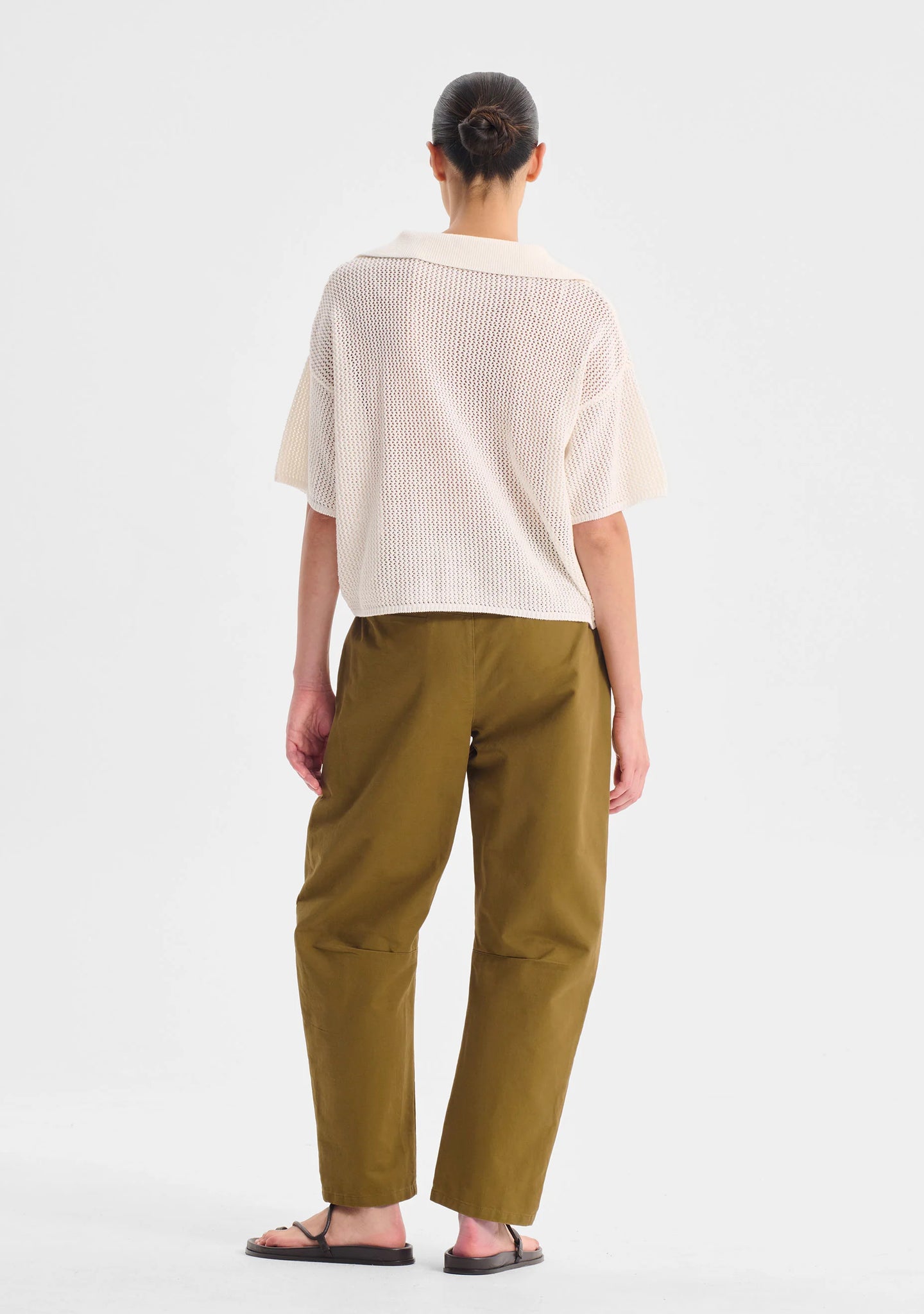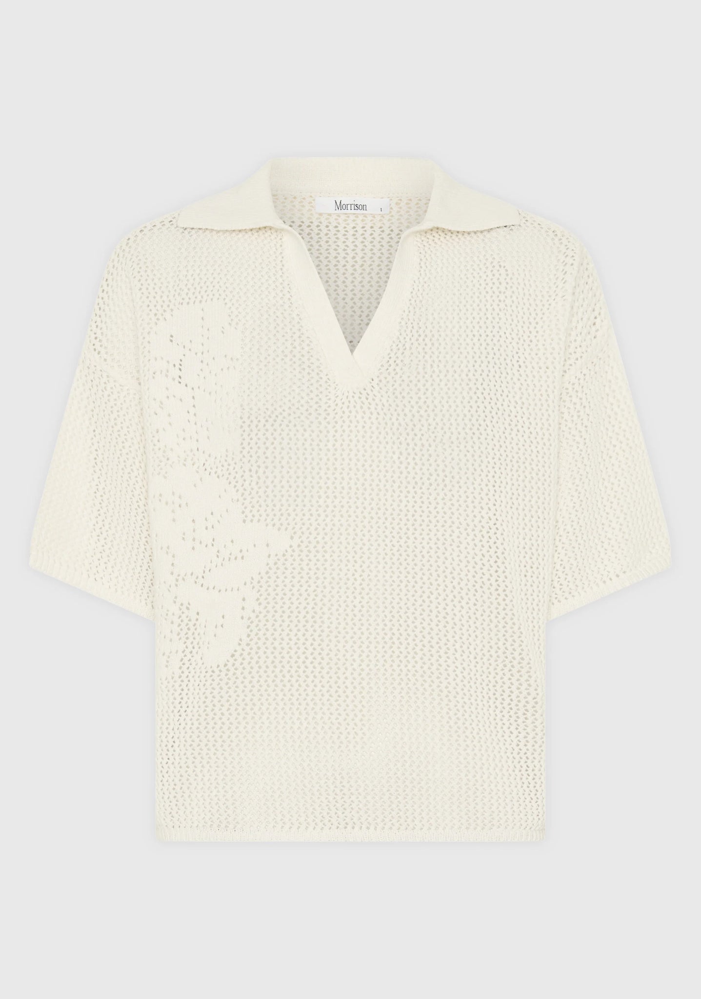 Made from cotton jacquard knit, the Chiara Top features a subtle floral motif and a soft polo neckline. With elbow-length sleeves, a relaxed boxy fit, and rib trim at the collar, sleeves, and hem, it blends texture and ease for everyday elegance.