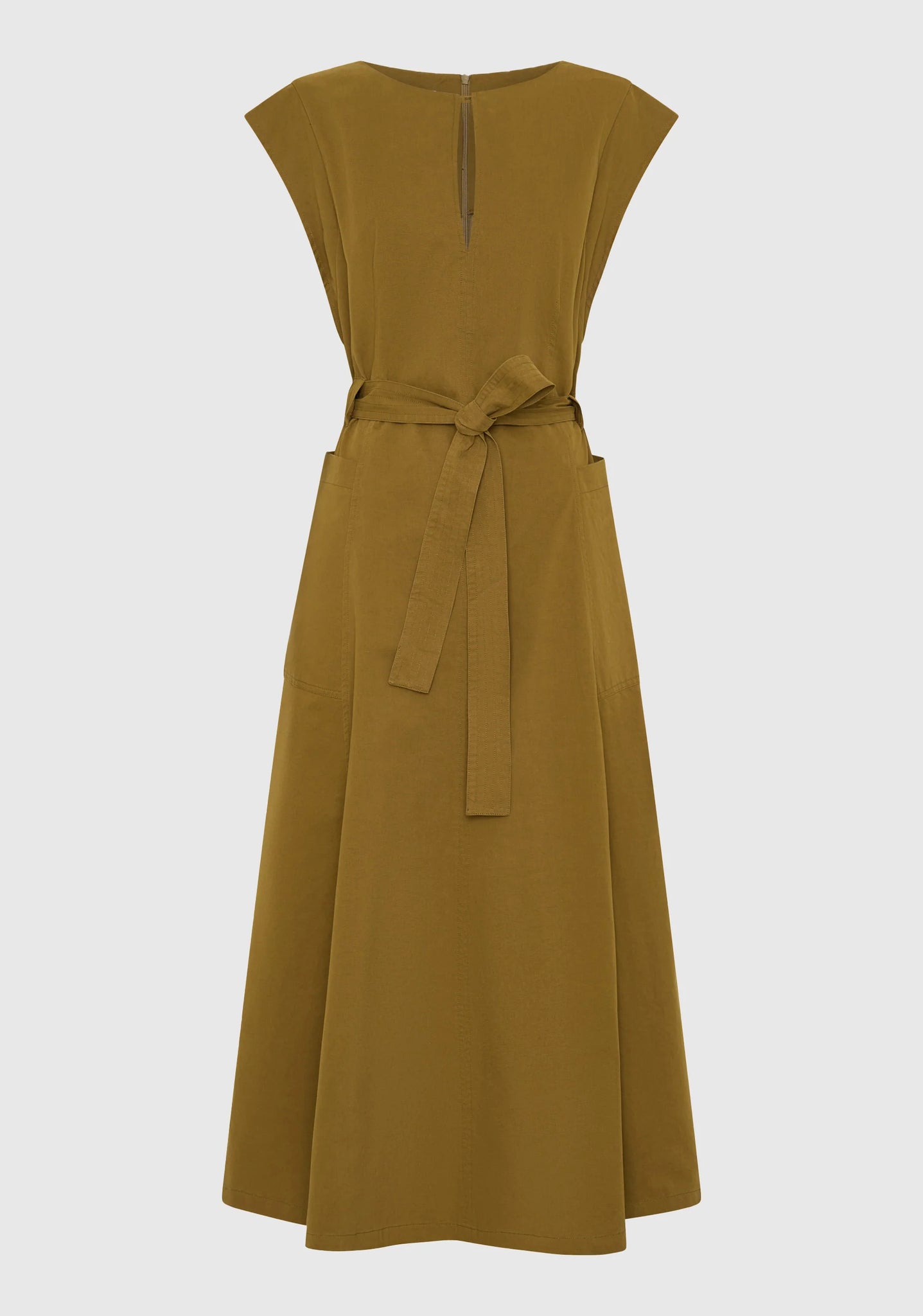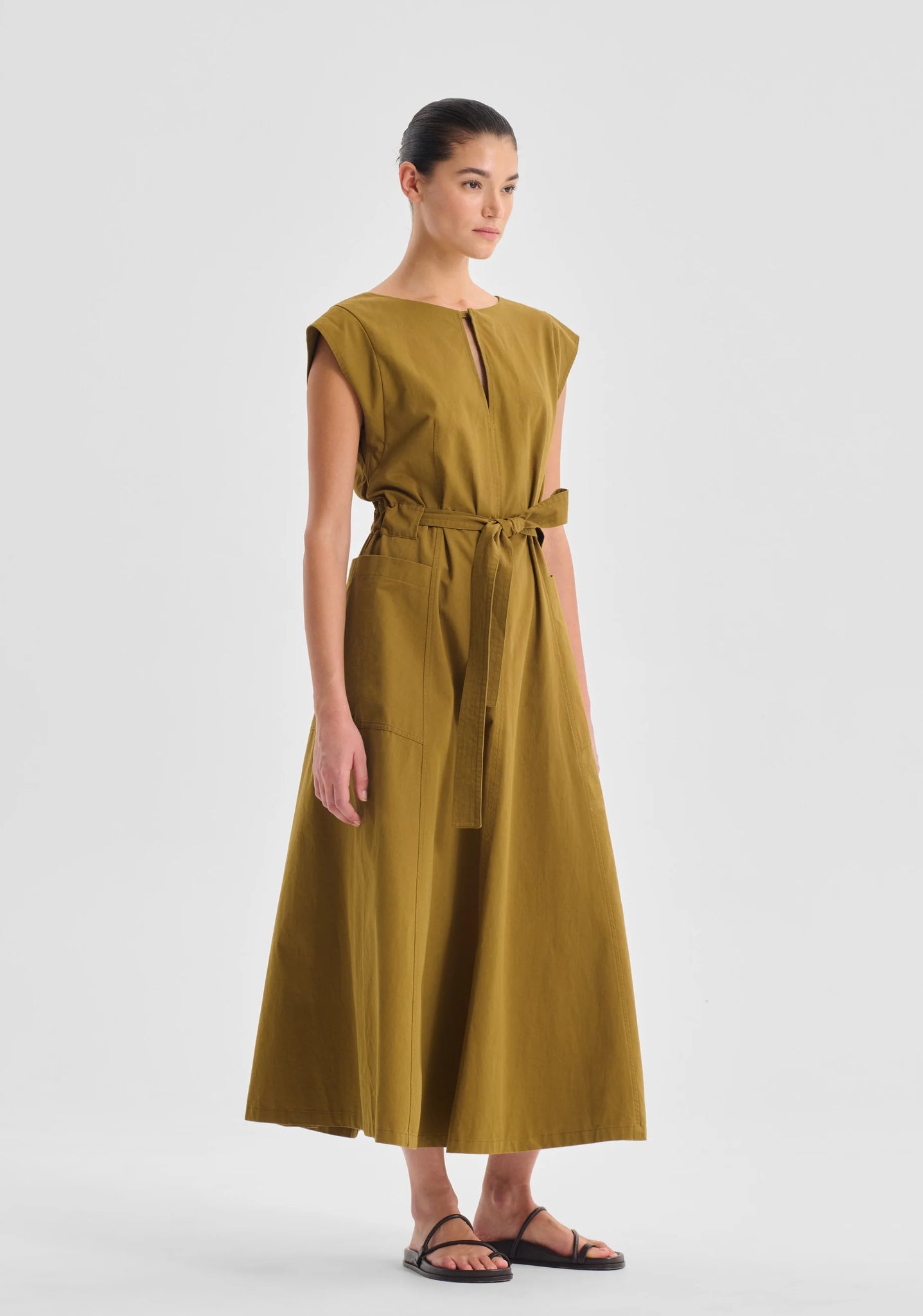 Crafted from mid weight peached cotton drill, the Marique Dress features a refined boat neckline with a keyhole and button detail, cap sleeves, and a zip at the back. Darts at the waist and a wide self-tie belt create soft structure, while large side patch pockets and a swing silhouette offer ease and functionality. Finished in a flattering midi length.