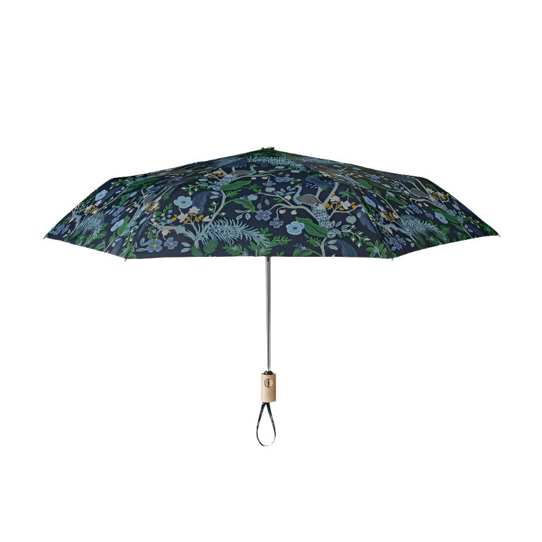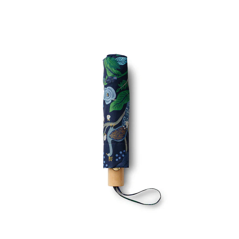 No rainy day blues here. Our Peacock umbrella features a wooden handle, a patterned sleeve, and an auto open/close function.