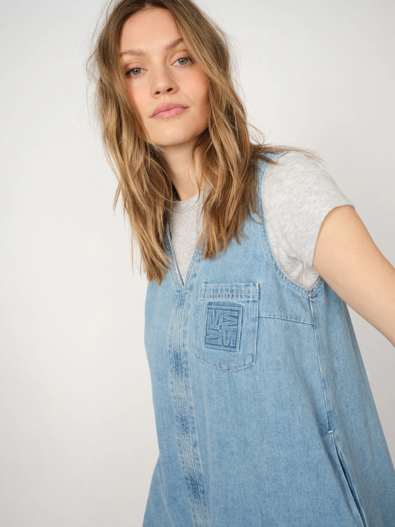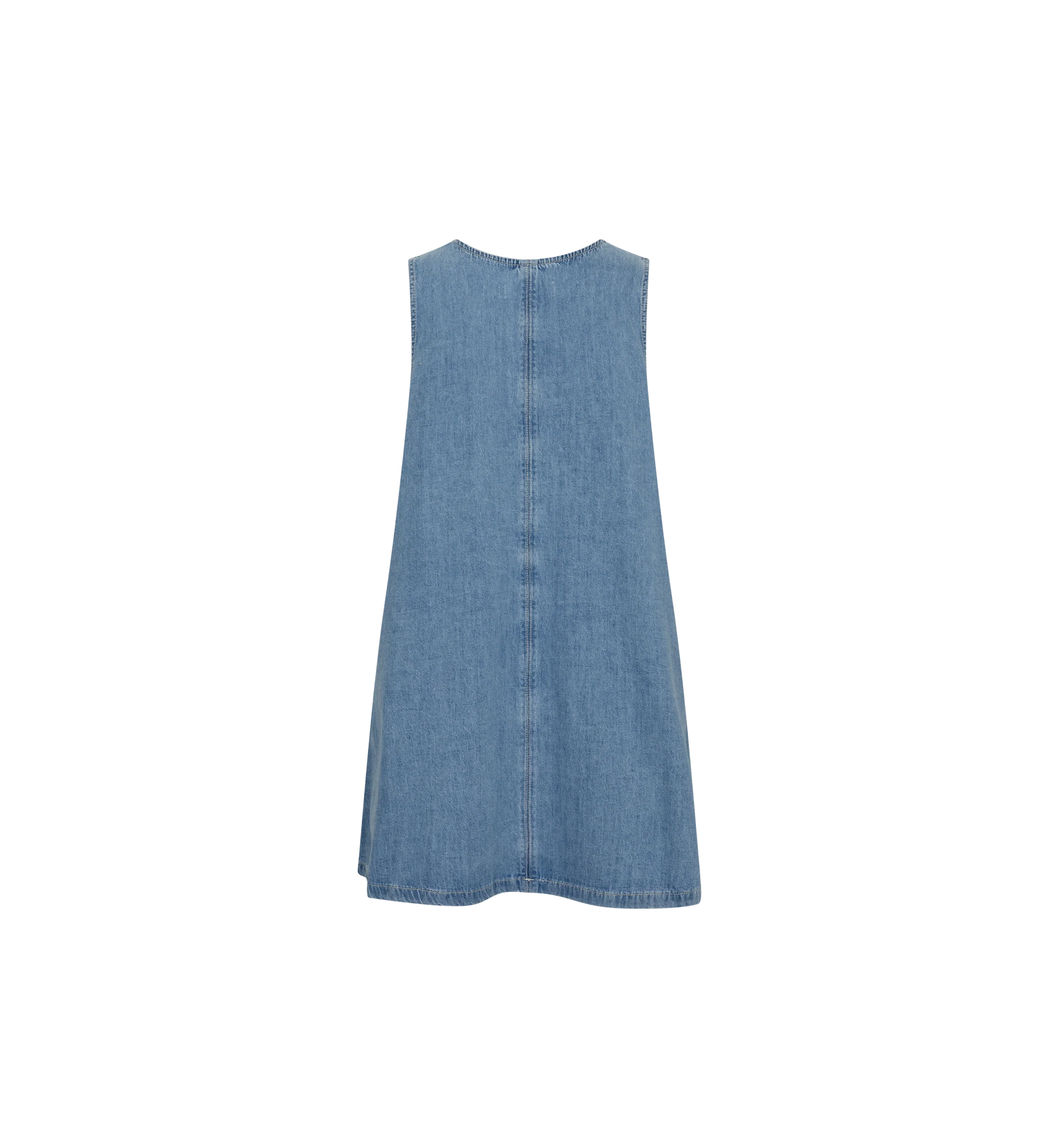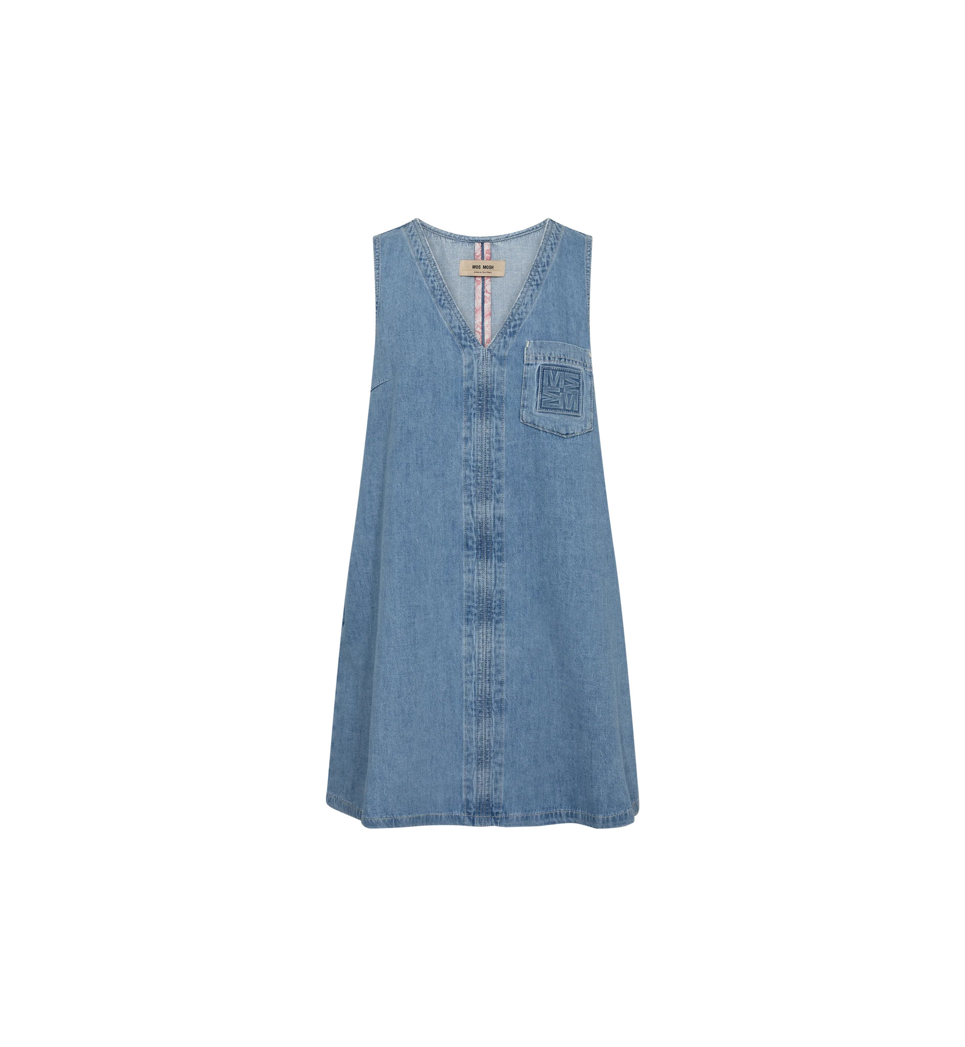 This chic denim dress is the ultimate summer staple, combining style and ease in one breezy design. Crafted from soft, lightweight denim, it features a flattering A-shape with a V-neckline that exudes casual sophistication. A chest pocket with an embossed logo adds a subtle branded touch, while the enhanced front seams lend structure and modern appeal. Finishing details, like practical side pockets and hidden paisley accents within the seams, add a playful and unique twist. Wear it layered over a tee for a laid-back vibe or style it solo with sneakers for a fresh, minimalist summer look.