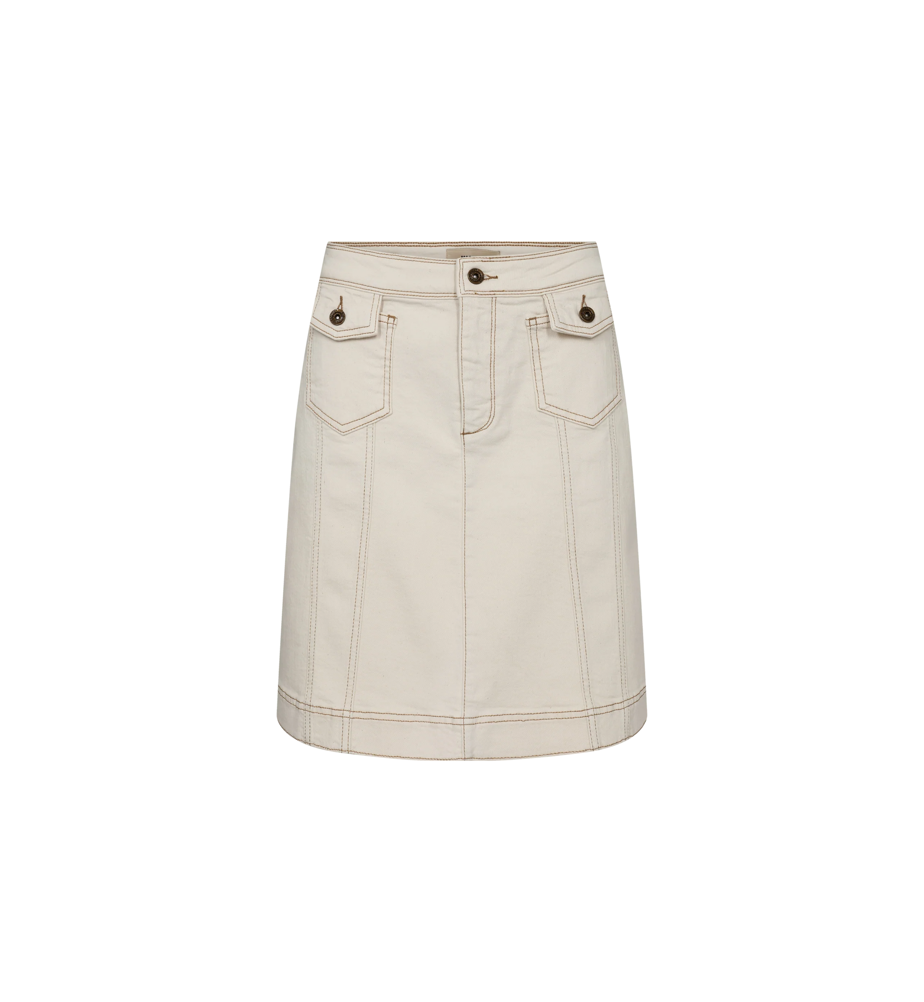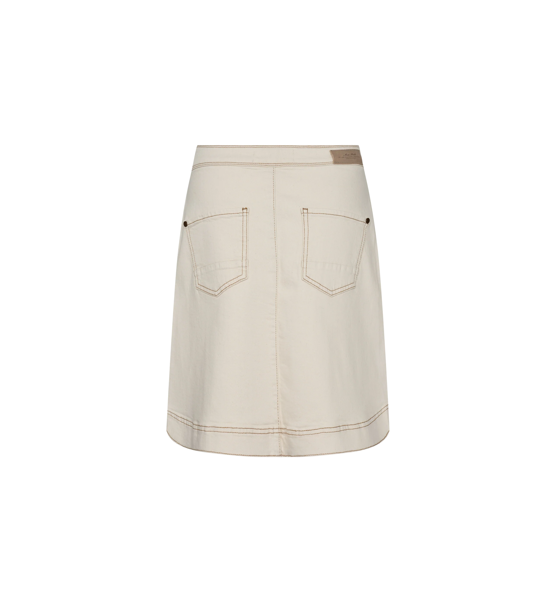 This effortlessly stylish skirt is an ideal choice for warm summer days, combining functionality with a touch of modern flair. Designed to sit high on the waist, it flatters the silhouette while providing a comfortable fit. The skirt is finished with attached front flap pockets and back pockets. The dark contrast stitching stands out beautifully against the light-coloured base, creating a bold and eye-catching detail. Pair it with the matching jacket for a coordinated ensemble or tuck in a fitted tee to achieve a sporty and chic vibe.
