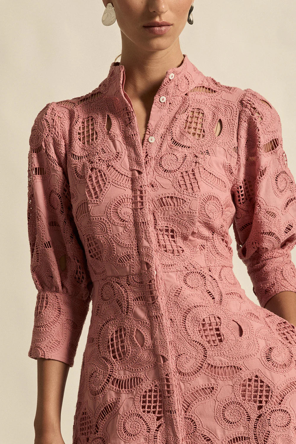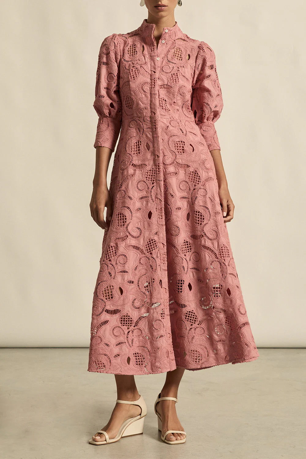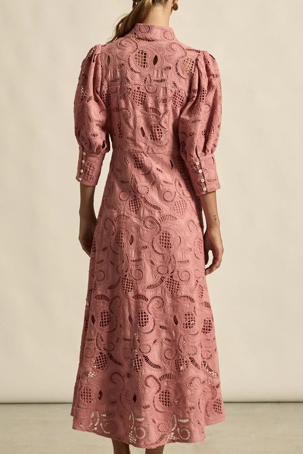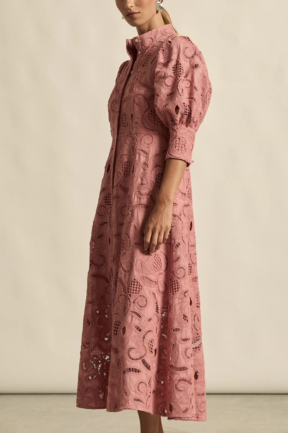 romantic yet structured, the gateway dress is designed for modern occasions with timeless appeal. its intricate lace, sculptural sleeves and refined finish create a dress destined for special moments. • crafted in 100% cotton lace with soft cotton lining • high neck stand lends elevated structure • subtle blouson sleeve finishes at the elbow • concealed placket and fit-and-flare silhouette for a polished look • midi length, ideal for events and occasion wear • feminine yet modern with textural detail