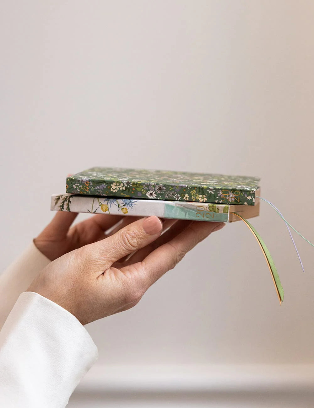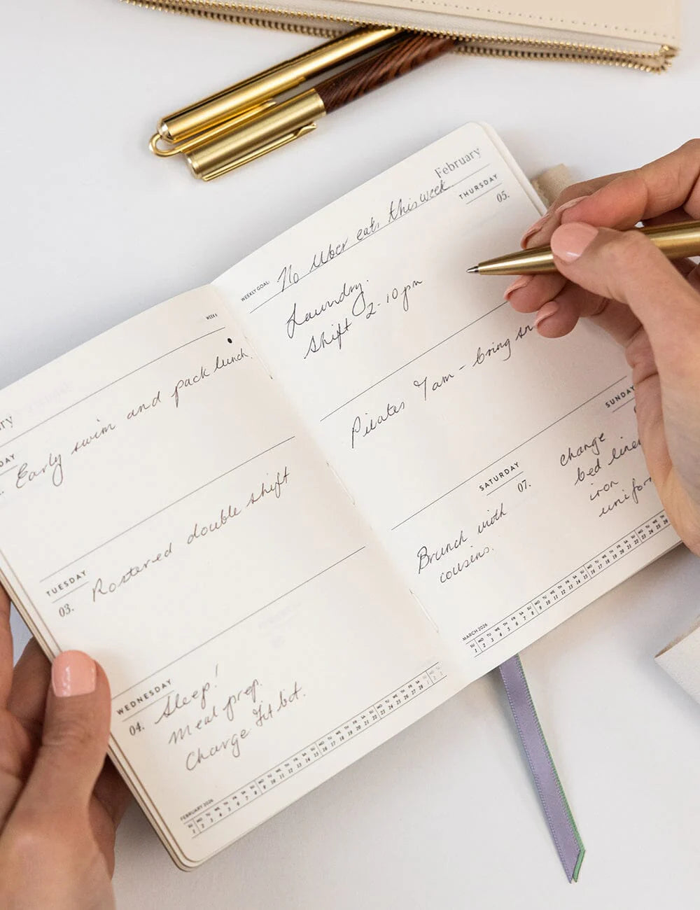 Our Pocket Planners feature lay-flat binding, where the cover isn’t attached to the spine - allowing the pages to open flat. This format typically doesn’t allow for ribbon markers, but we’ve thoughtfully designed a solution by strategically placing them within the page spine for a seamless and practical finish.