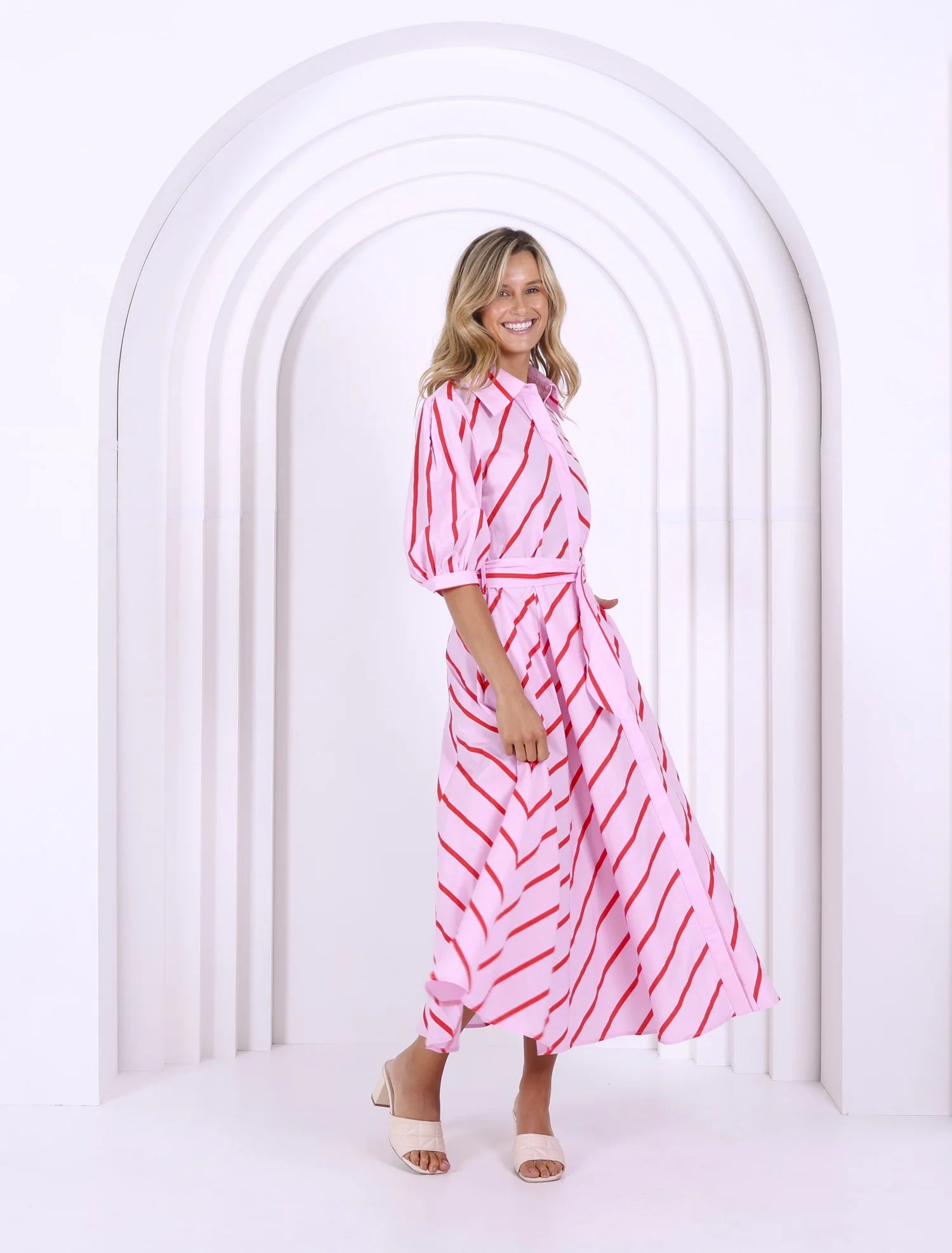 Yarn-dyed stripes enhance the preppy aesthetic of this pure cotton shirtdress, which is designed in an A-line silhouette, relaxed bodice with a flared skirt and finished with our signature elbow-length pleated balloon sleeves. A removable matching belt allows for versatility in styling and waist definition.