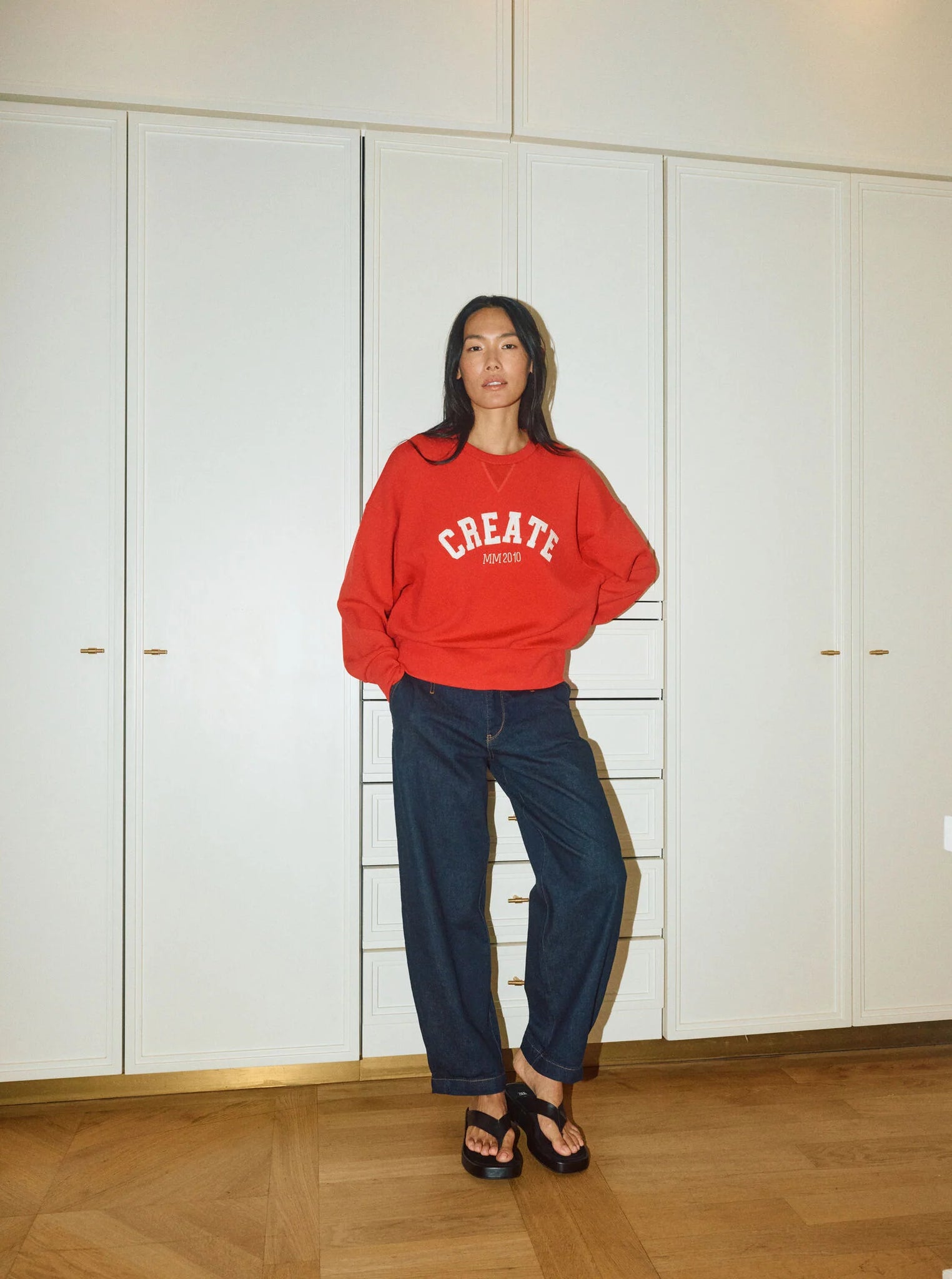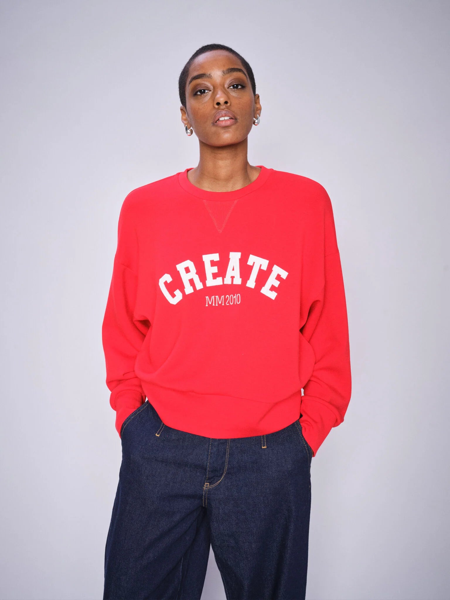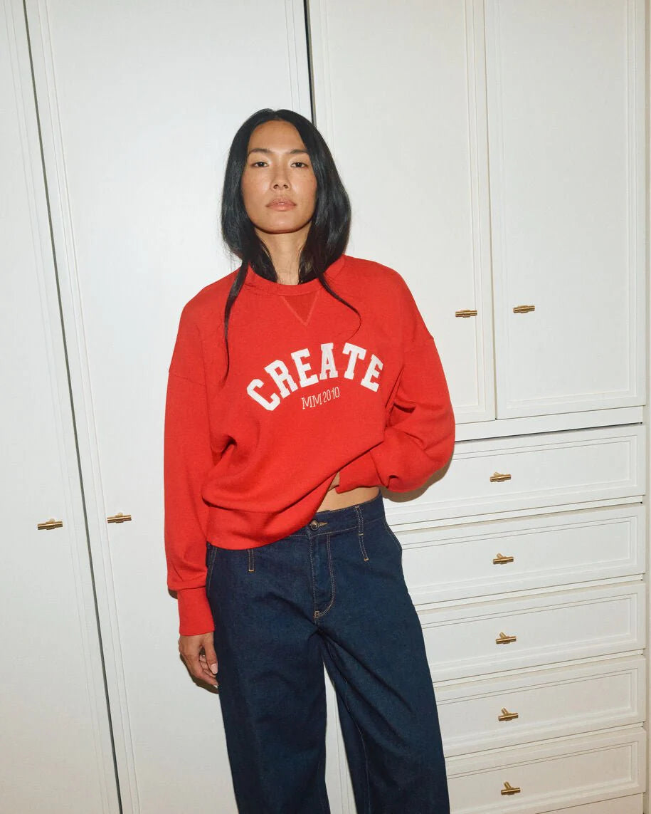 Achieve effortless cool with this must-have sweatshirt, featuring a relaxed fit, drop shoulders, and bold chest lettering. With its voluminous sleeves and preppy, retro college vibe, it pairs perfectly with dark blue denim for a standout look.