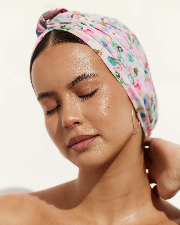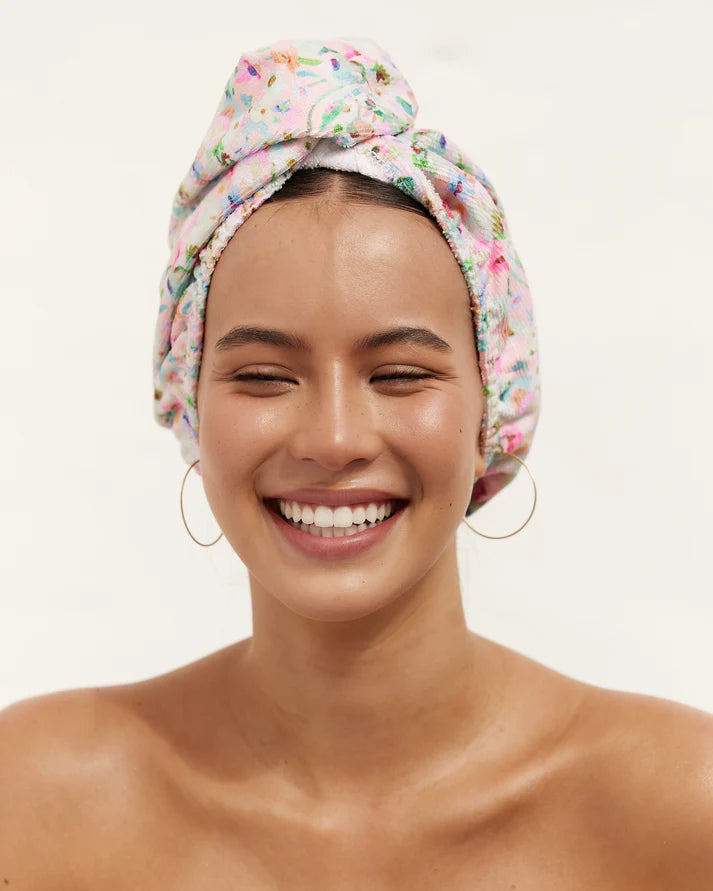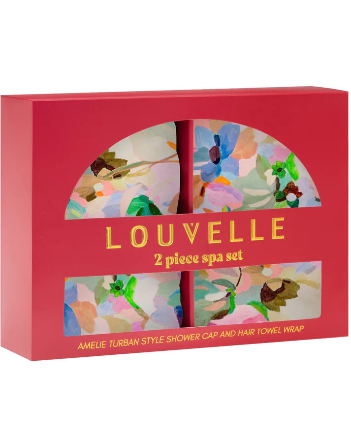 Features Amelie turban style shower cap and hair towel wrap.