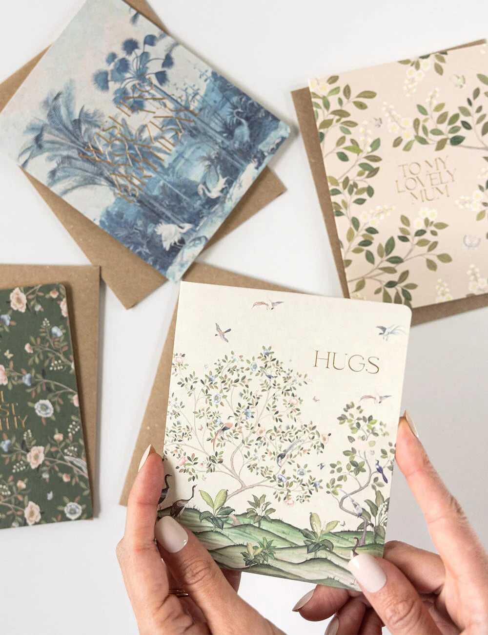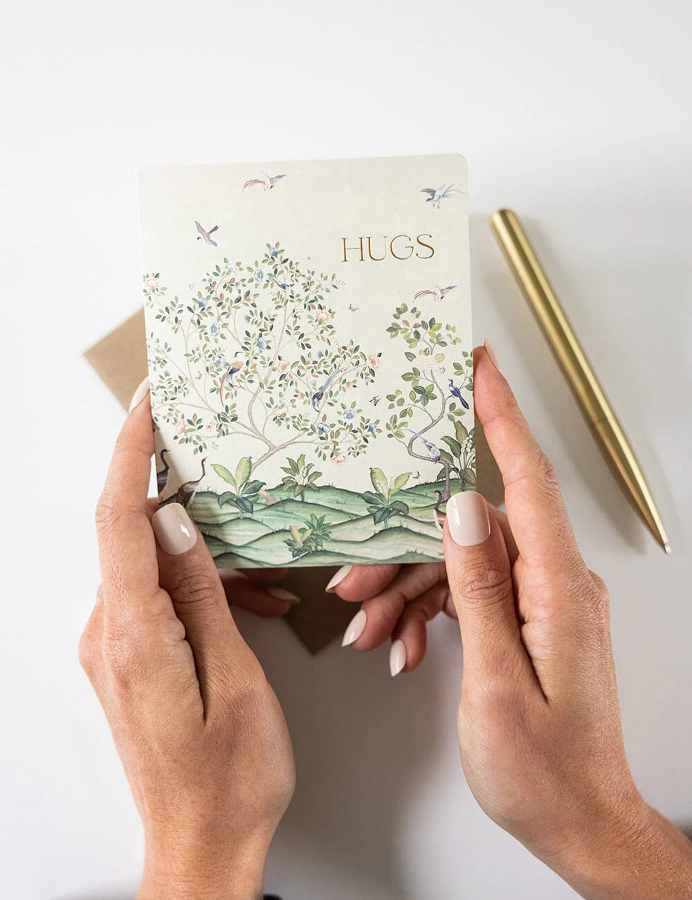 Letterpress hot foil printed greeting card "Hugs - Spring Landscape"