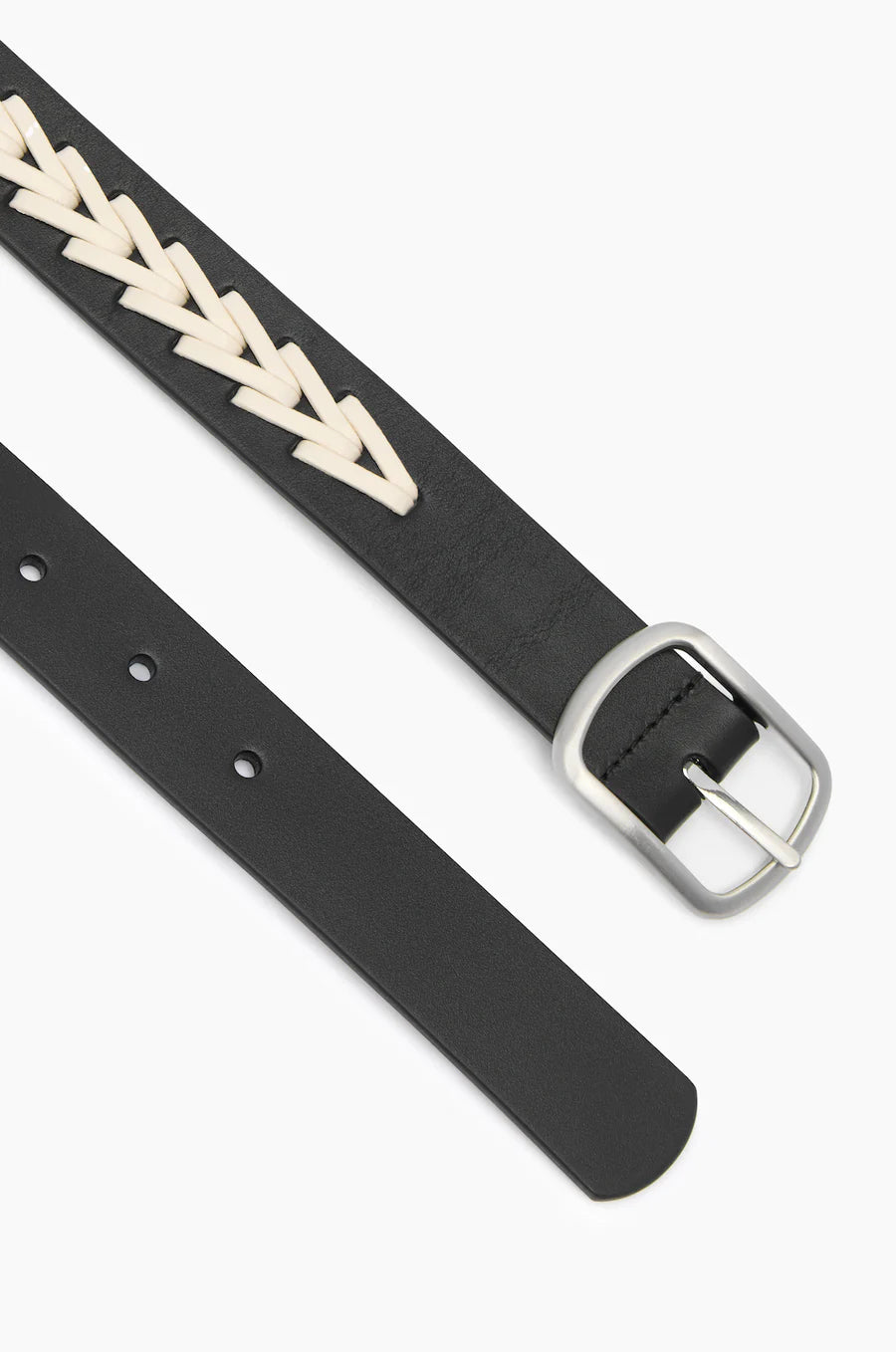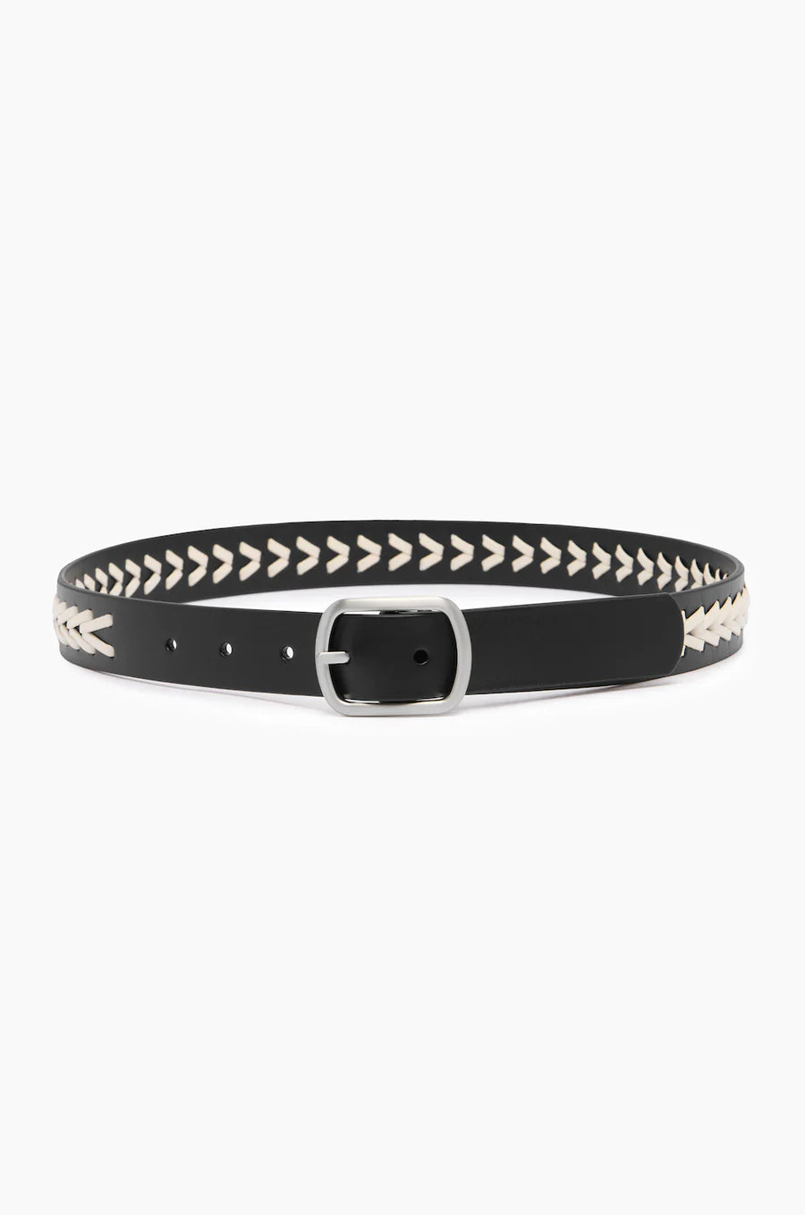 The contrast Joan Belt features supple black leather with a unique ecru woven insert. Pair this style with a skirt or favourite jeans for a distinctive look.