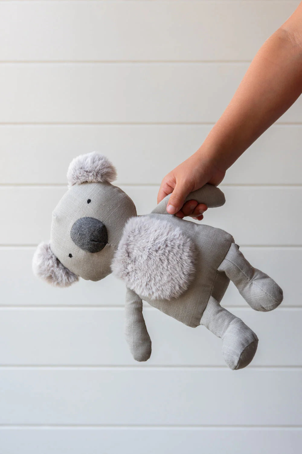 Keith is the shyest & gentlest of the Aussie Animals. His shyness is eclipsed only by his huge heart. So afraid of the world is Keith that he often spends months clinging to the eucalyptus tree at home on the million-acre cattle station 400km west of Byron Bay. Recently, however, from the vantage of his leafy abode, he spotted his friend Wally Wombat alone & lost. Keith took a big eucalyptic gulp, climbed down his treehouse & gave Wally a big Koala cuddle. When Wally felt that soft tummy & fluffy ears, he knew he was safe.