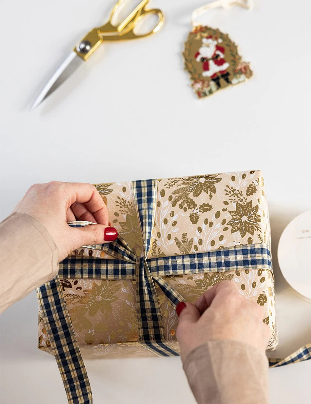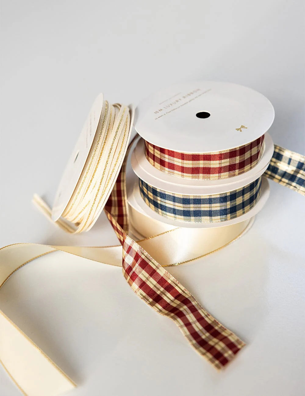 10 metres of gold foil tartan ribbon, on a gold foil printed cardboard spool.