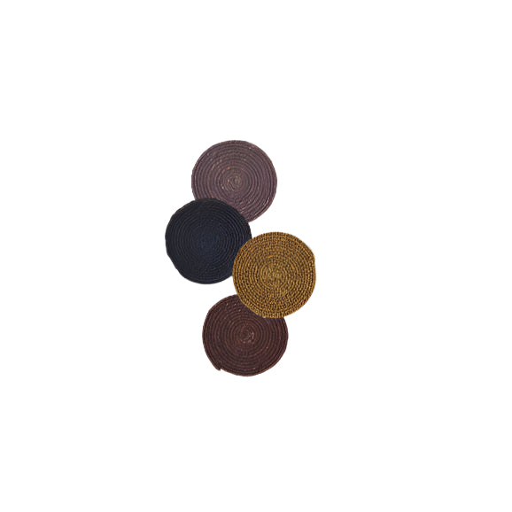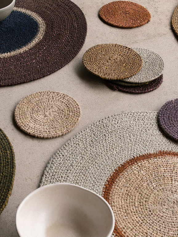 The coasters are handwoven in India using natural seagrass. Traditional weaving techniques celebrate the craftsmanship and create a unique, organic finish.