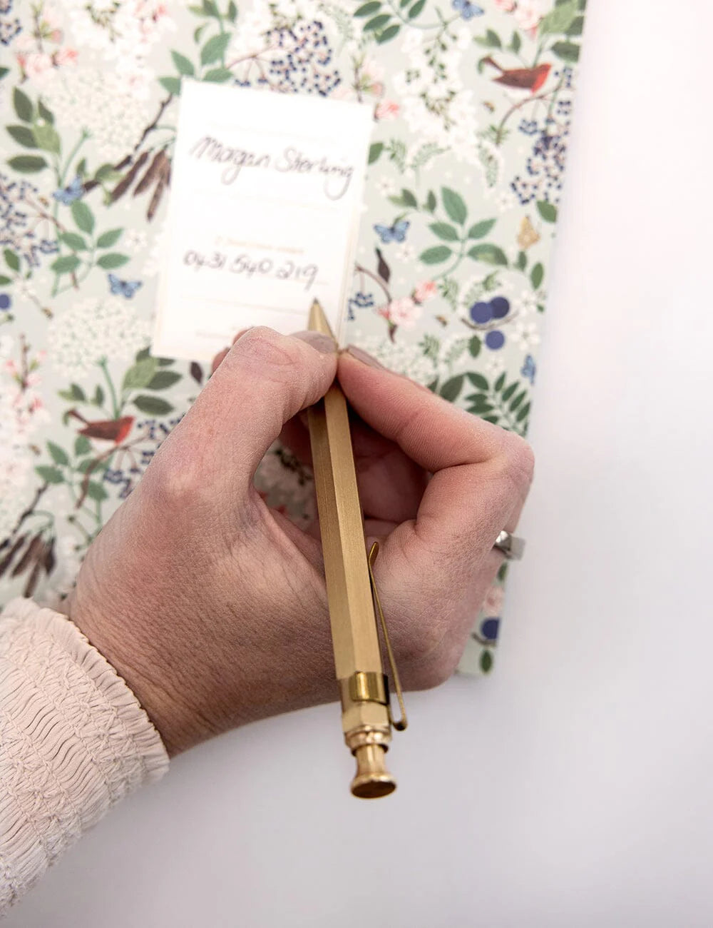 Solid Brass pen with vintage hexagon detailing, retractable ballpoint, and features a pen clip. Now comes in a lovely gold foiled gift box.